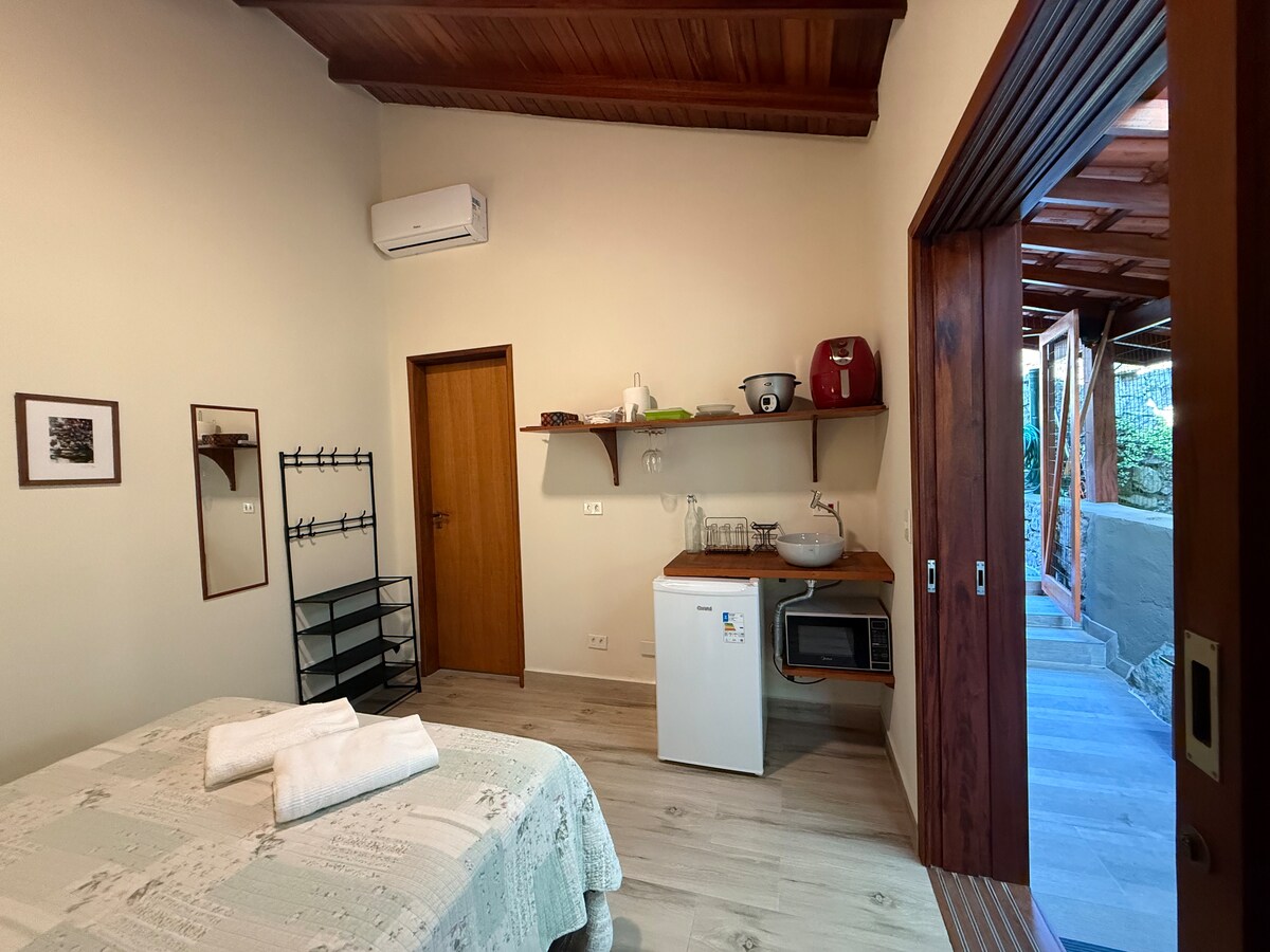 The Canoas Suite has just been renovated and was prepared with great affection. Ideal place to relax and unwind after a delightful day at the beach and lots of sun! We have air-conditioning and a wall fan to cool your night, a new minibar to chill your drinks and food, and Wi-Fi with a router inside the room. We are close to the charming Itaguá waterfront, with delicious restaurants and beautiful shops! We live next to the Suite and are always available to give tips and necessary support