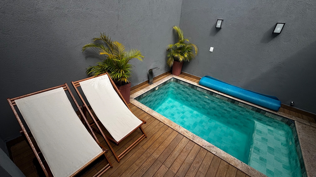 - Parties/gatherings are not allowed on the premises. Private studio in a small condominium of independent studios, furnished with air conditioning, double bed, retractable sofa, 50” smart TV, wardrobe, full kitchen and backyard with deep pool (1.50 m) of water heated by solar panel (sunny days are required to heat). Availibilizo towel, sheet, blanket, shampoo, soap. It accommodates 2 people well and can extend one more to sleep on the retractable sofa (fill in the number of guests in the reservation).