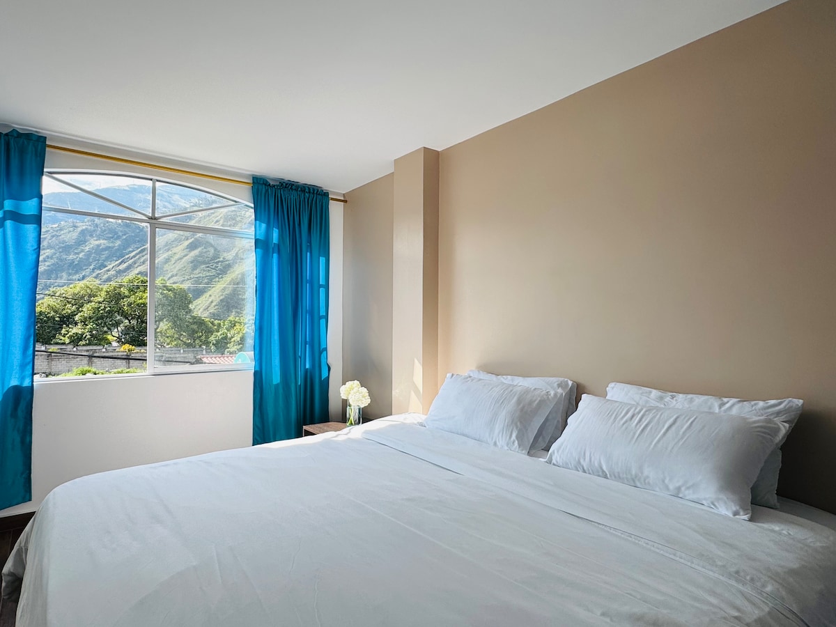 Lleva a toda la familia o viaja con tus amigos a este fantástico alojamiento que tiene un montón de espacio con un balcón privado y una vista increíble al parque nacional Llanganates. Estamos ubicados cerca al centro de Baños, a 10 cuadras de la Basílica de la Virgen de Agua Santa y a cuatro cuadras del Terminal Terrestre. Ideal para tu descanso.