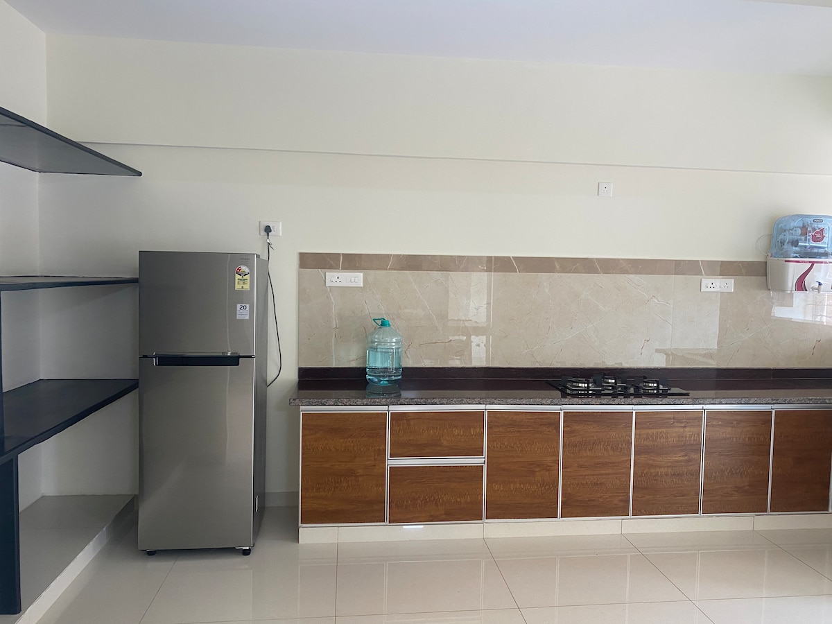 Luxury 3 BHK Family Retreat Experience a blend of city convenience and peaceful living in our spacious 3 BHK apartment. Specifically curated for families seeking a premium "home away from home" experience. Available only for families. The Space 3 Airy Bedrooms: Spacious and well-ventilated for restful nights. 3 Modern Baths: Clean, contemporary, and fully equipped. 3 Private Balconies with natural light and fresh air. Modular Kitchen: Fully equipped for all your home-style cooking needs.