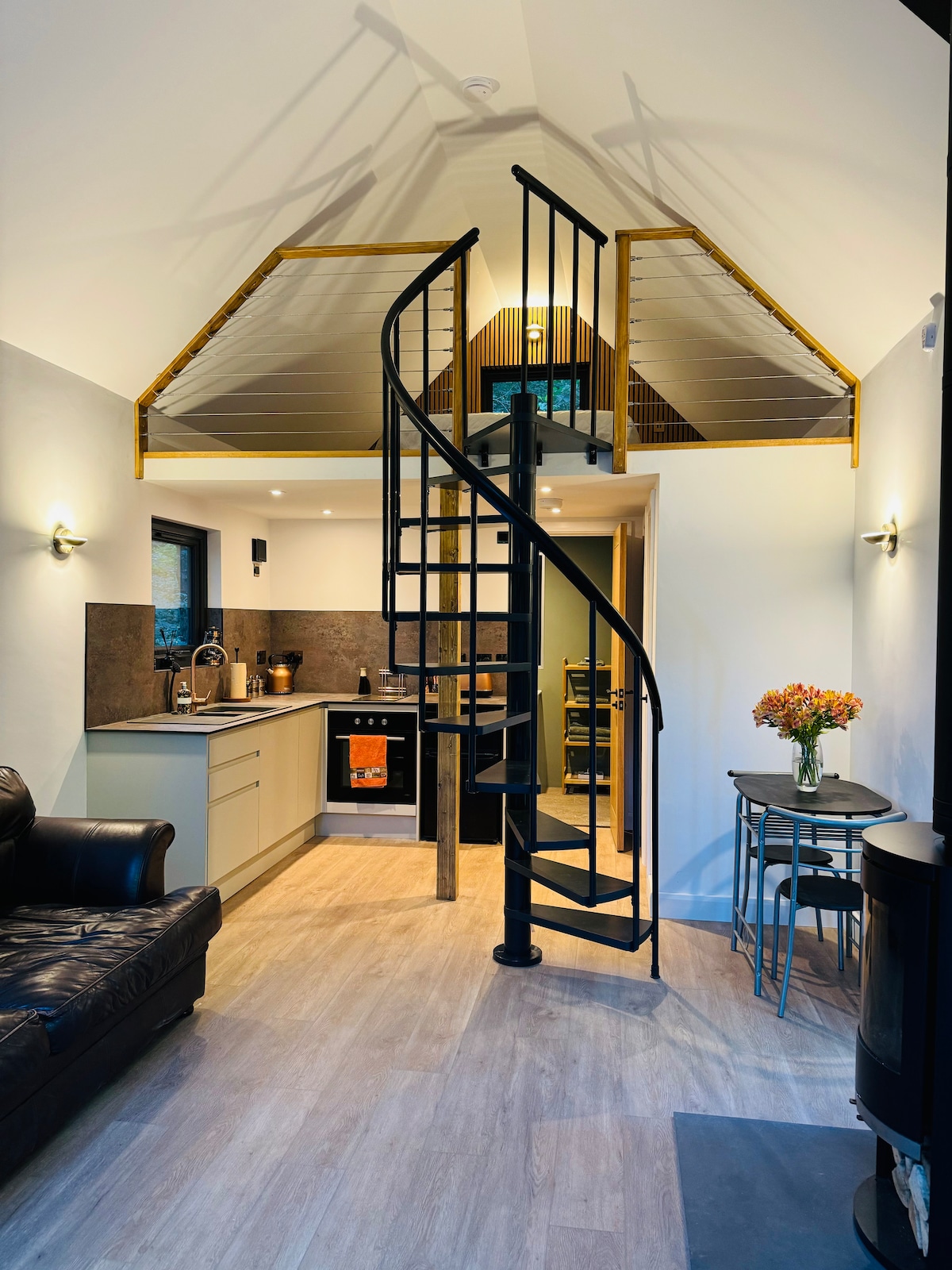 As you enjoy the short buggy ride down to the far end of our woodland you will be astounded when you come across our beautiful woodland cabin set in the treetops. You will immediately feel relaxed as you immerse yourself in the surrounding nature. Lounging chairs on the decking provide the perfect place for your morning coffee listening to the birds sing and soak away your stress in the wood fired hot tub then cosy up in front of the log burner and enjoy the tranquility of the woodland.