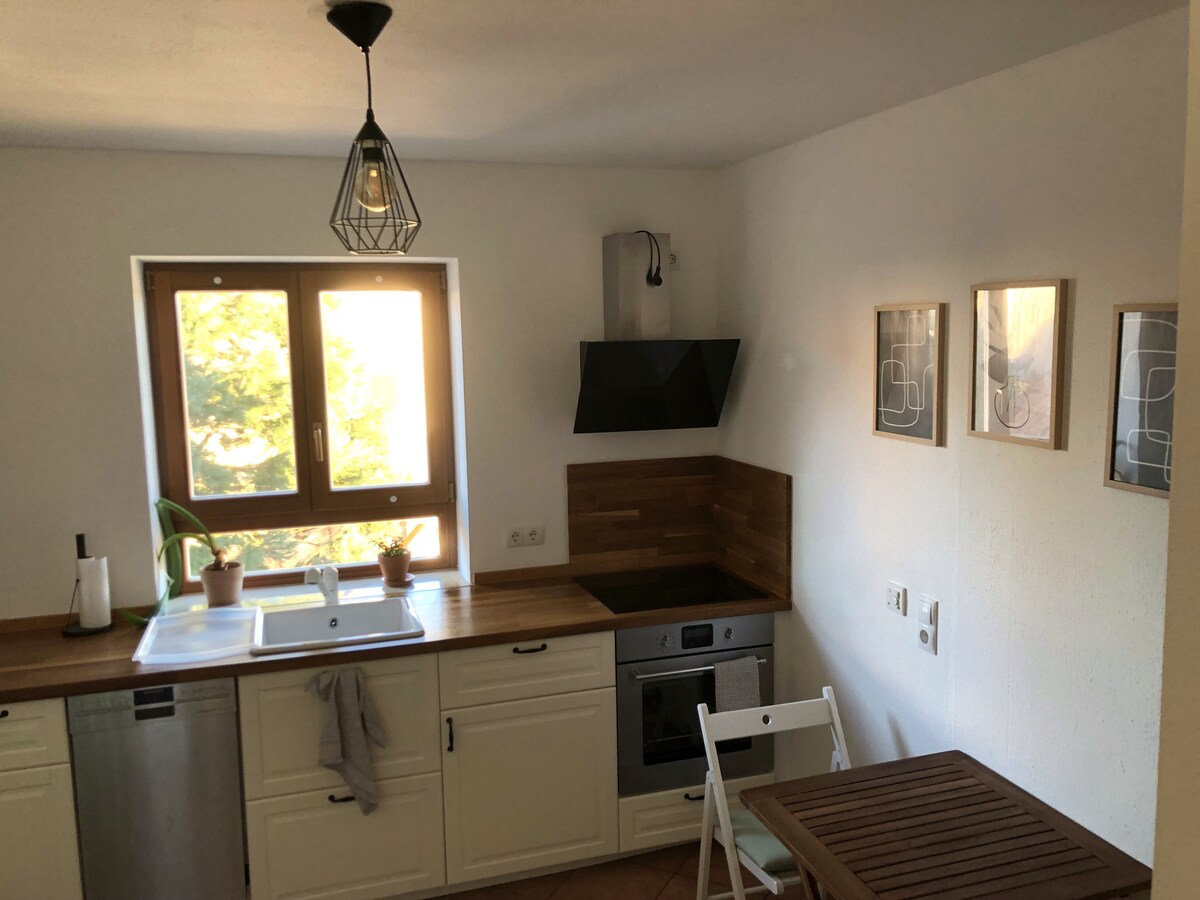 Find peace and relaxation in the spacious and lovingly furnished apartment. Live out your creativity, relax and find yourself. Workshops can be booked on site: baking bread, making cheese, wild herbs, sewing, and making your own environmentally friendly products (washing, cleaning, cosmetics). Invite yourself to my place, enjoy a little piece of paradise and cuddle with our one and a half cats.