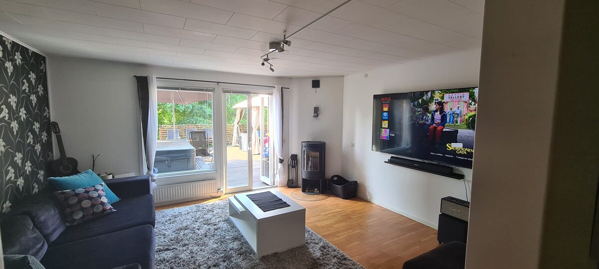 Private Villa with large and secluded garden on both the front and back sides. Barbecue and hot tub in the back by a large glazed conservatory, perfect for relaxing and cozy evenings with family or friends. Stone-paved terrace on the front in a sunny and wind-protected location. Large and colorful playroom with climbing wall, trampoline and much more where the children can play freely! Detached guest house with double bed on the property included. Free parking on the plot, with room for several cars.