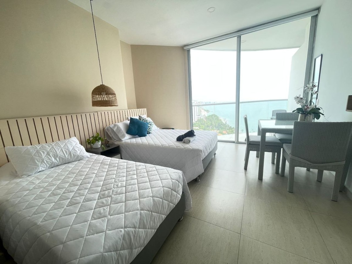 New oceanfront apt and the Pozos Colorados nature reserve. Stunning beach view and unbeatable location: 300 m from the beach, 5 min from the airport and close to restaurants, shopping centres and the iconic Rodadero. High quality amenities: Rooms with double A/C beds, Social and private bathrooms with hot water, living room with sofa bed and access to panoramic balcony. Fully equipped kitchen, Smart TV. Pool and security 24/7. Live a unique experience of Santa Marta!