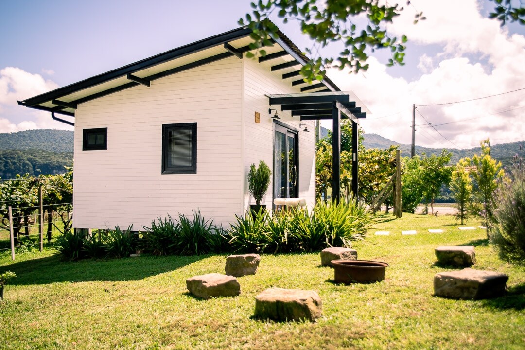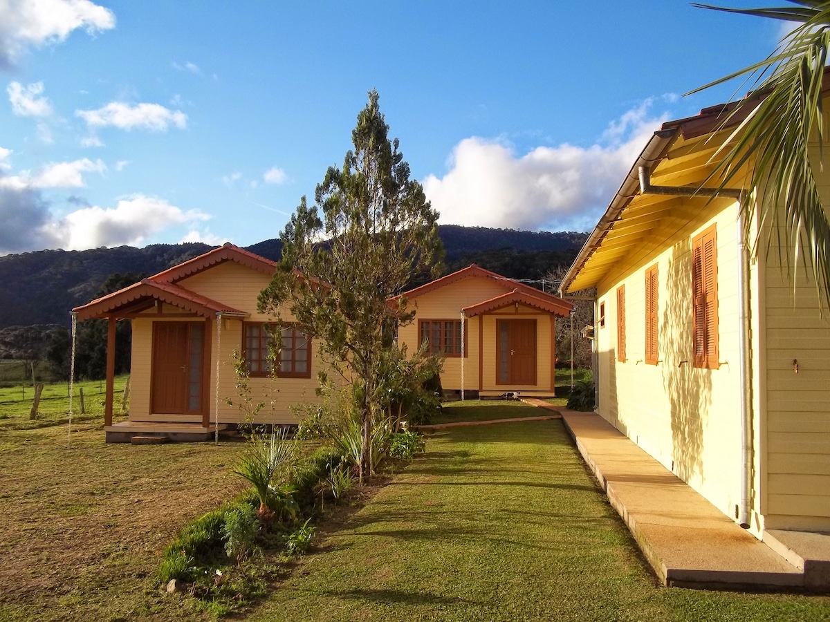 82 m² cabins with 2 complete and comfortable en-suites in a quiet place in nature, but close to the shopping center and plantations, 3 km away. Kitchen with refrigerator, stove, oven, microwave, dining table, barbecue and all basic kitchen utensils, including cups. En-suites with hot and cold air-conditioning, closets, Altenburg bed and bath linens, and views of nature. Living room with sofa, 32" TV with cable channels, quality Wi-Fi and heater.