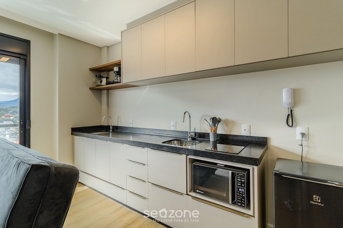 Modern Apt with a view of the mountain and city. Fully equipped with a queen bed, double sofa bed, air conditioning, Smart TV, and full kitchen. Enjoy the cozy balcony and the strategic location in Urubici, close to restaurants and markets. The building offers a gym, electric car charger, wi-fi, and parking. Book now and enjoy the comfort and sophistication of this exclusive space!