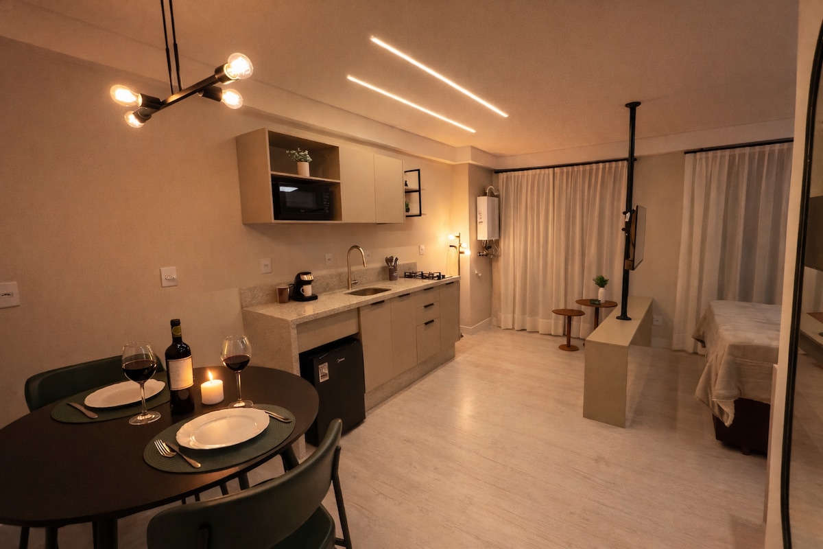 Modern and cozy studio in the center of Urubici! The space offers comfort, practicality and a great location, ideal for leisure or work trips. Perfect for couples looking for a romantic atmosphere without giving up the practicality of the city in Serra Catarinense. Well-equipped environment. Market and pharmacy 150m away and restaurants in the area. Private parking, exclusive laundry for the building, access by facial biometrics and electronic lock for more security and practicality.