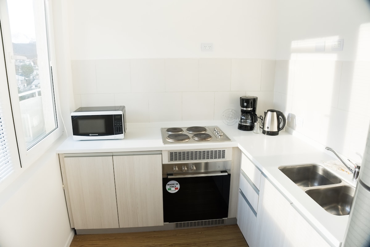 Beautiful apartment just a short walk from downtown Ushuaia. It has a bedroom with a double bed or two twin beds. The kitchen-dining room is spacious and comfortable, and has all the equipment so that you have total independence. Equipped with Smart TV with cable and high-speed Wi-Fi internet. The bathroom is spacious and fully equipped. Don't miss the terrace with 360 degree views of the entire city. This special place is close to everything, making it easy to plan your visit.