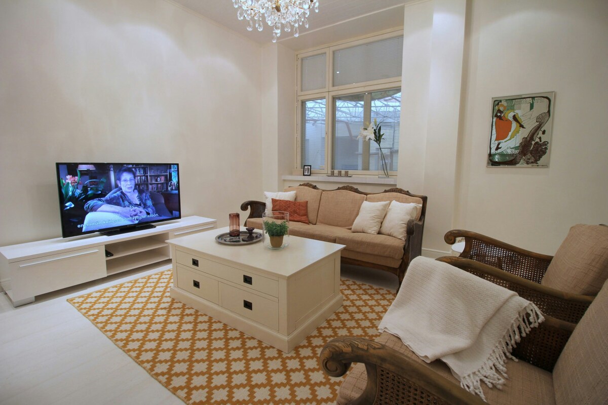 Luxury Boutique Art Deco läpitalon house steps from Central Station. This spacious 100 m² two-bedroom residence sleeps up to 4 guests and combines timeless design with modern comfort for an elevated city stay. ✧100 m² of bright, open living space ✧2 large bedrooms ✧Private sauna for full relaxation ✧Cozy fireplace ✧Rainfall shower for a spa-like experience ✧Large Smart TV with free Netflix ✧Fully equipped modern kitchen ✧Washer & dryer for convenience ✧Prime central location – walk everywhere