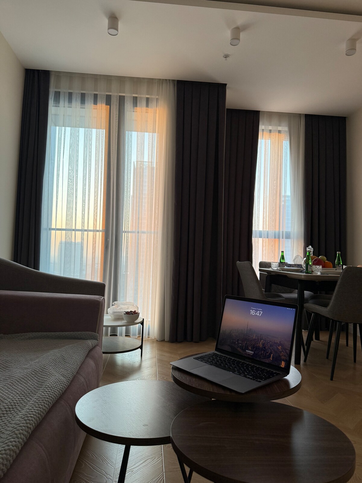 A refined retreat where style meets comfort. Floor-to-ceiling windows brighten the Scandinavian-inspired interior, with elegant furnishings and a fully equipped kitchen. Guests enjoy high-speed Wi-Fi, secure parking, a modern gym, and a rooftop terrace with stunning city views. Set in prestigious U-Tower with effortless access to the city center, it offers a truly elevated living experience.