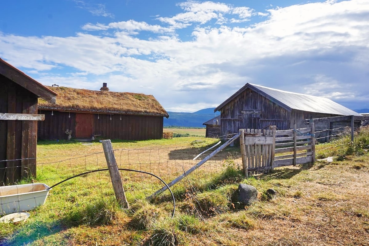 Storhytte på gårdstun i naturskjønn fjellbygd.