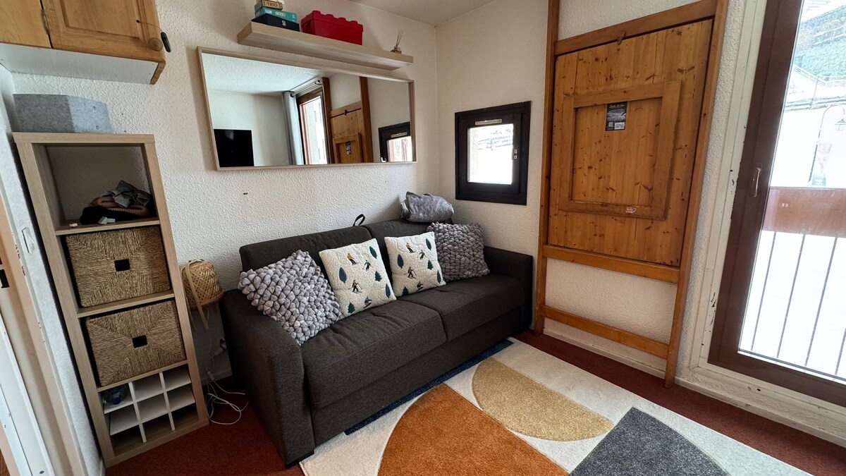 Renovation carried out in summer 2024. 1 bedroom: 1 double bed + 1 single bed Living room: 1 double sofa bed or 5 places in total. 30 m apartment, southwest facing in a small 3-storey residence with a terrace overlooking the children's ski and toboggan runs. Located in the heart of the 3 Valleys, in Val Thorens, in the center of the resort, on the plateau of Place Caron in a cul-de-sac. Cleaning and linen included in high ski season but not included in low season off ski