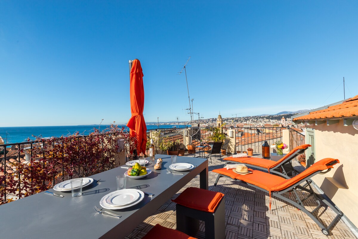 Rue du Malonat, in the old town, quiet, 4 min walk to the beaches, I offer you my very quiet apartment, on the roof terrace with panoramic sea view from the castle hill to the Esterel. Very sunny 12 m² terrace. Comfortable apartment: air conditioning, Wi-Fi, fully equipped kitchen and shower room. Separate bedroom. Large sofa bed in the living room. Ideal location for a pleasant stay in Nice on foot. See you soon. Pets not allowed.