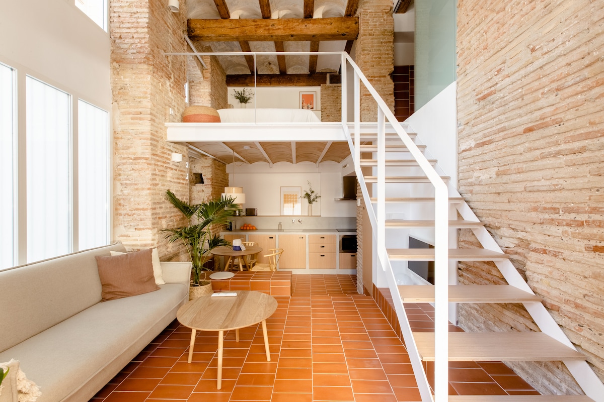 Loft located in the heart of the maritime district of Valencia, El Cabanyal, 5 min. from the Malvarosa beach. House built in 1900 and completely renovated without losing its essence. This stunning apartment fuses traditional architecture with chic boho design in a natural textured setting. Gaze at the high vaulted wood-beam ceilings and exposed brick walls as you dine in the marble kitchen area and cool off in the spacious rain shower.
