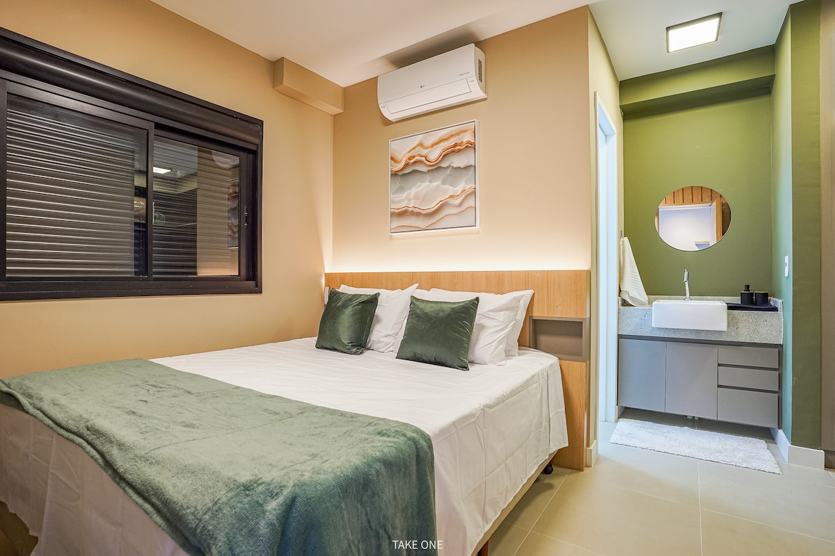 Serving with comfort and practicality in a modern, fully-equipped studio. It has a comfortable bed, quality linen, air conditioning, fast Wi-Fi, Smart TV and full kitchen. Strategic location and high-end condominium, ideal for work or leisure. Perfect for those seeking convenience, convenience and excellent stay experience.
