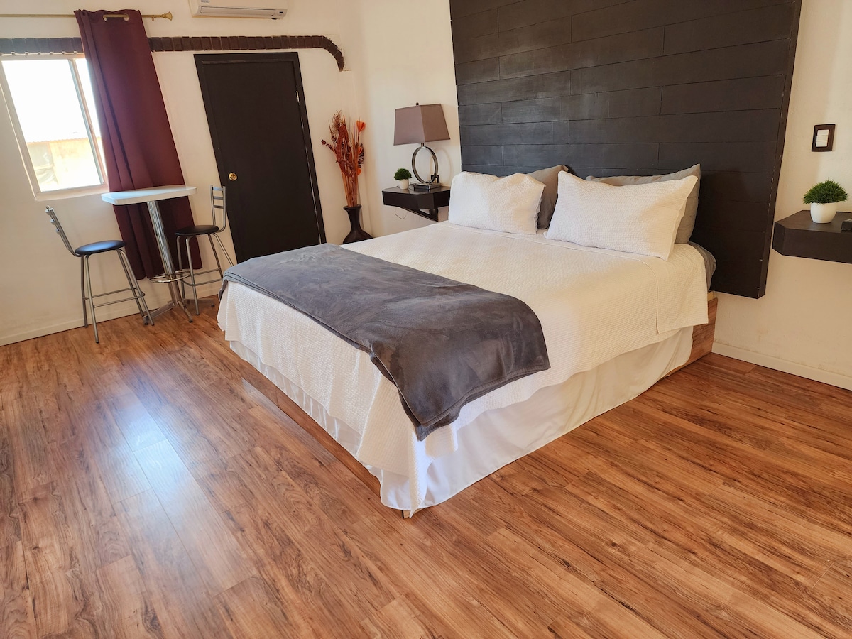Room designed for a pleasant rest and to enjoy sunrises, sunsets, the sky, stars, and the moon from your terrace. Suitable for two people, with a Queen bed, air conditioning, fan, coffee maker, hot water, and high-speed satellite internet. Perimeter wall for privacy and security. The bathroom has a mirror, soap, shampoo, conditioner, hand towel, and hairdryer. Enjoy vineyards and wineries in Valle de Guadalupe. Safe and close to the region's most iconic places.