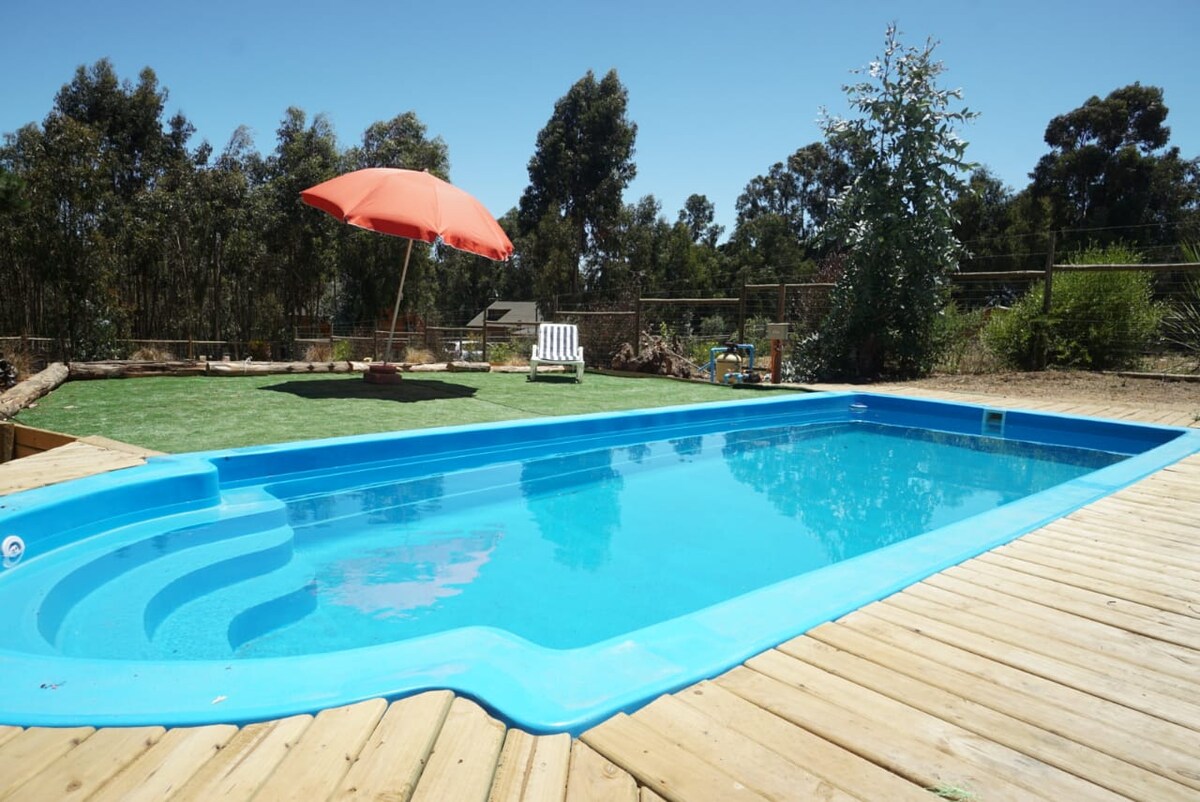 Beautiful family cabin, enjoy the countryside and sea, interact with animals on a guided tour and enjoy a unique experience, 20 minutes from the beach and with a mobile shelter that can take you there in 5 minutes for free. The cabin has 1 double bedroom and 2 bedrooms with comfortable bunk beds, for 6 people, kitchen, living room, quincho area and individual hot tub, the latter has an extra cost (value to be paid in advance each time you want to turn it on), sand court and pool.