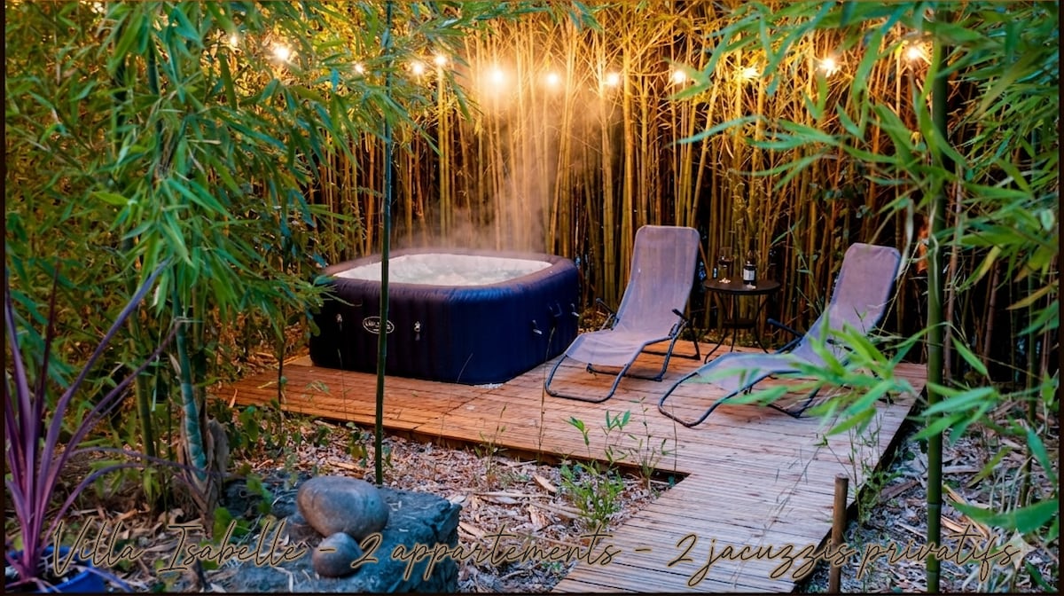 You deserve a real vacation. Enjoy the charm of Villa Isabelle located in a quiet area consisting of 2 well-equipped independent cottages, 2 private jacuzzis. 2000 m² of forest and garden that surround it offer several varied spaces to enjoy a good time in complete privacy. Its many corners invite you to relax in the Zen garden, under the bamboo arbors in the Jacuzzi that bring freshness and poetry. Enjoy the BBQ, bikes or games (FREE).