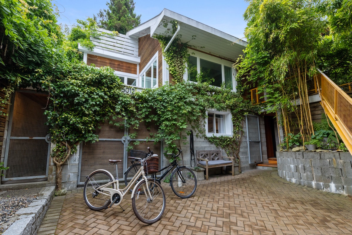Our love of exploring the city by bike led us to finding this home in the neighbourhood of nearby Quilchena park. With the Arbutus Greenway running behind our property there are miles of walking and bike paths to explore. Under the towering bamboo you will find your private entryway, plenty of free street parking nearby and bikes right outside the door for use during your stay. The space is well equipped with fridge, stove, microwave, toaster, coffee maker and blender for smoothies.