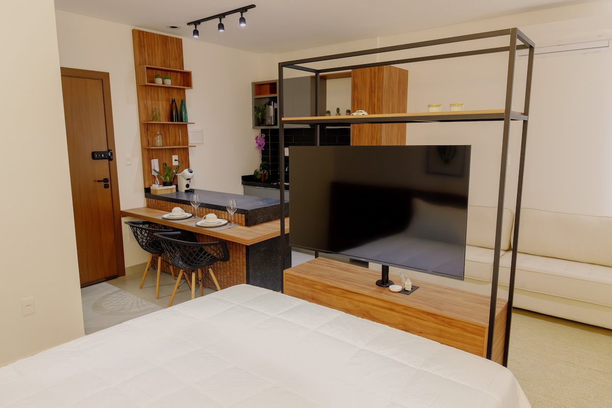 Studio London – Swimming pool, 300 Mb Wi-Fi and garage. New 34 m² studio, modern and cozy, with hot/cold air conditioning and standard hotel trousseau. Kitchen equipped with induction cooker, microwave, minibar, Dolce Gusto coffee maker and purifier. 50" Smart TV, fast Wi-Fi and balcony. Located in the prime area of Três Corações, just 4 km from the Fernão Dias Highway.