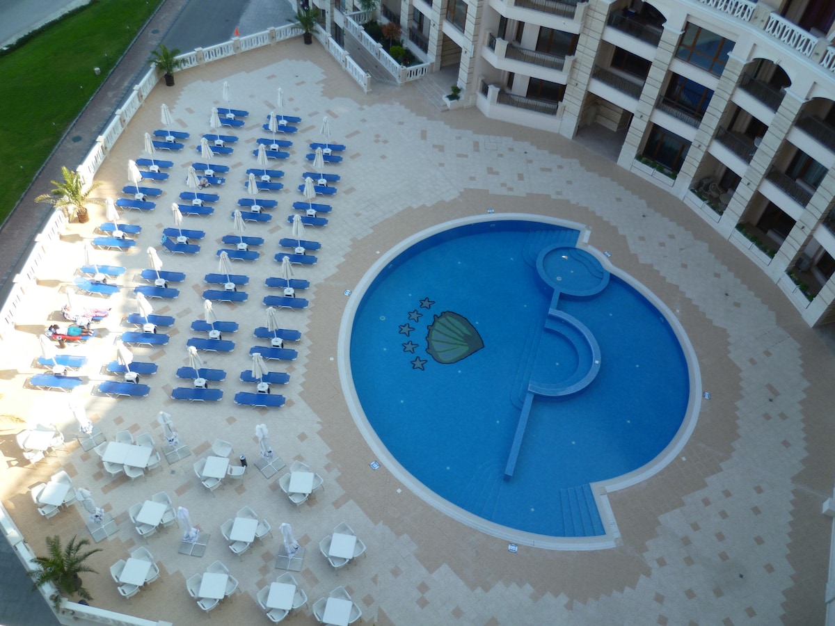 We present to your attention a cozy sunny design studio in a modern new building in the heart of the Golden Sands Resort. You can enjoy a perfect sea view, a fully equipped kitchen and free Wi-fi. The private swimming pool has a free outdoor pool with sun loungers and umbrellas. The beach is 300 meters away.