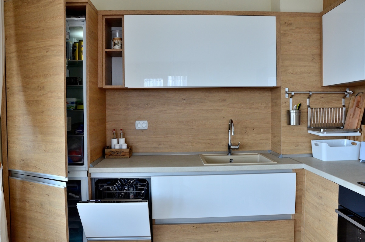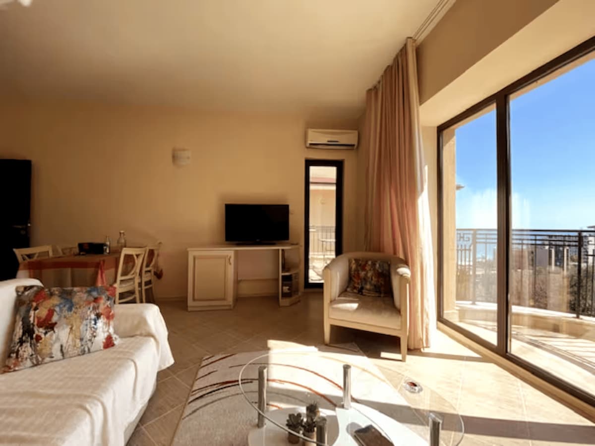A cozy apartment featuring a beautiful glass-enclosed veranda, perfect for morning coffee, relaxed evenings, or remote work with natural light, just a short walk from Kabakum Beach and the Riviera coastline. Enjoy free access to the beaches, nearby mineral springs, cafés, and seaside restaurants. A comfy bed, a folding sofa, high-speed wi-fi, 2 workplaces with comfortable chairs, and a fully equipped kitchen make it perfect for relaxing stays, remote work, or exploring Varna and Golden Sands
