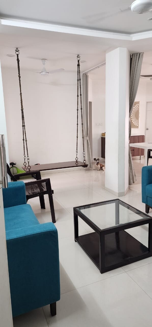 We only Host Families. Full furnished apartment in a gated community, with two bedrooms, a large family room with open terrace, dining area, and a fully equipped kitchen. Two full bathrooms, one attached and one common, both with running hot & cold water. Both bedrooms as well as the living room are equipped with AC. Kitchen equipped with refrigerator, RO for drinking water, microwave, induction cooktop, utensils, cutlery, crockery etc. and washing machine in wash area. 43" TV in living area.