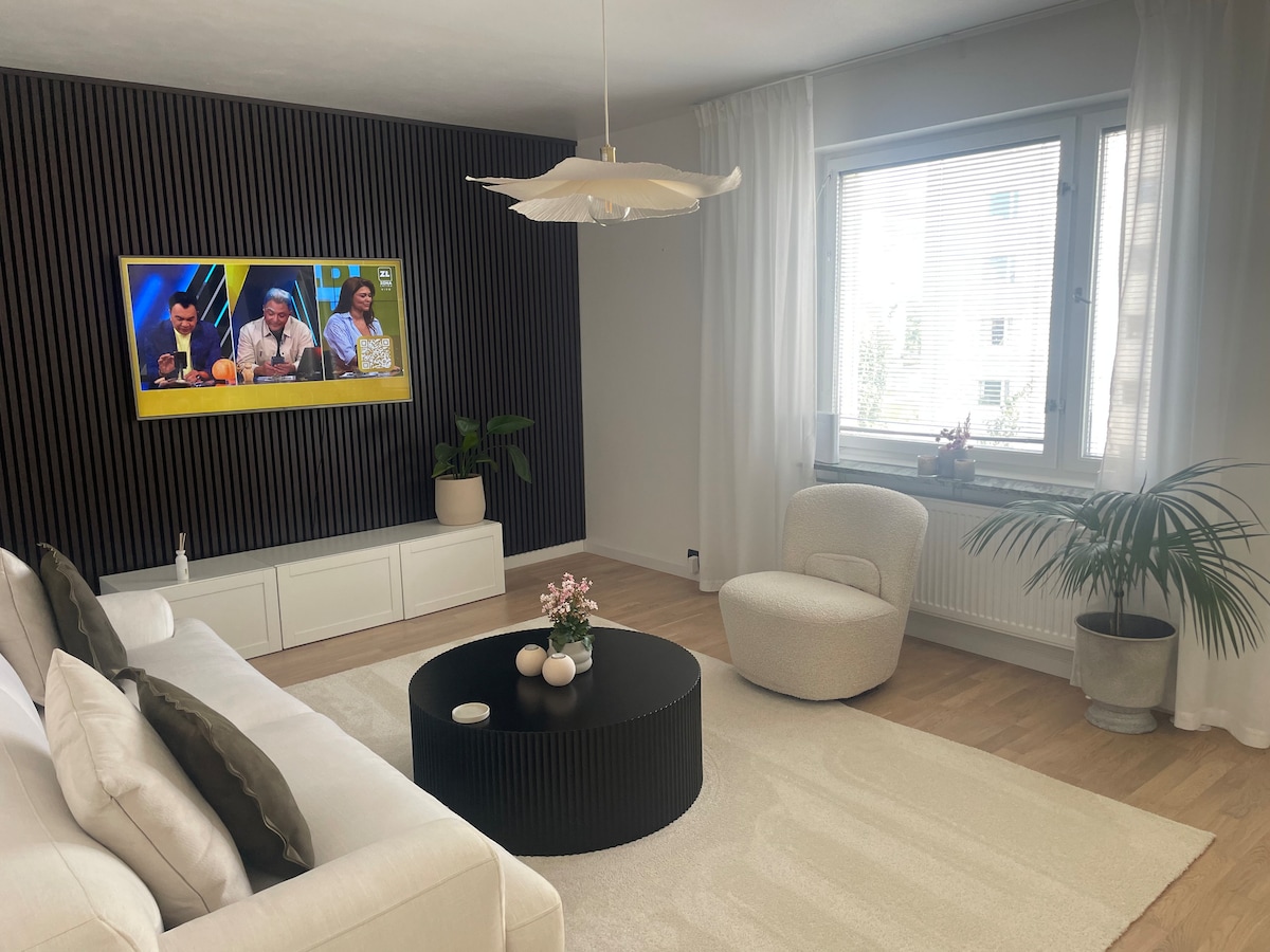My modern apartment accommodates up to three guests. Enjoy the large balcony with a cozy sofa set and nice views of nature. The area is quiet and family-friendly with forest and park nearby for walks and bike rides. The apartment has a TV with Netflix, HBO and Amazon Prime, as well as a dishwasher and washing machine. You also have your own parking. Nearby are several restaurants, including a Mediterranean restaurant, pizzeria, Burger King and Asian restaurant. I am looking forward to welcoming you!