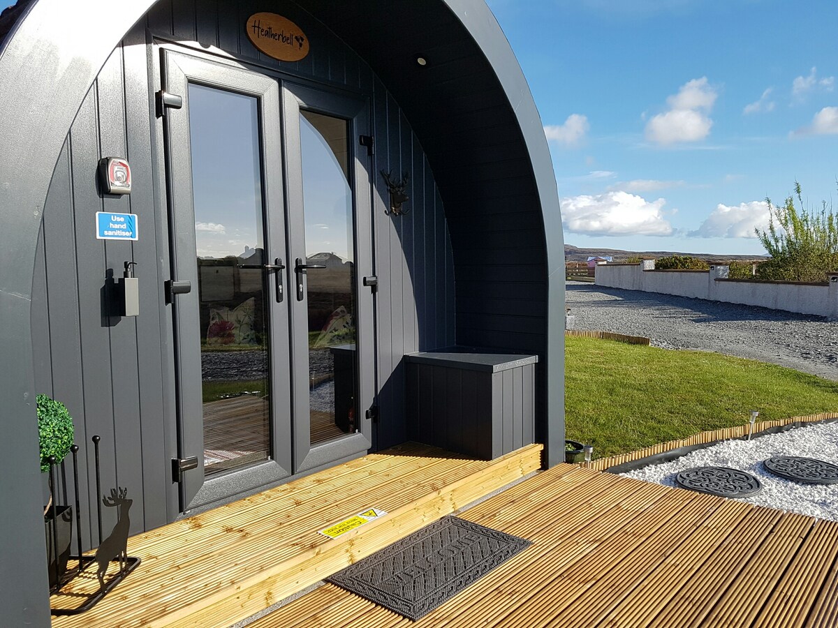 Welcome to Heatherbell. The pod is a perfect getaway for 2, with everything you could need and is just 5 minutes drive from Lochboisdale ferry terminal. Heatherbell is a fantastic base for exploring our stunning landscapes and wildlife. Enjoy the splendid sunsets from the decking. In late summer it is surrounded by lovely purple heather which grows freely and abundantly spreading its glorious purple hues across our hills and glens. This is one of two glamping pods at Croftend Glamping.
