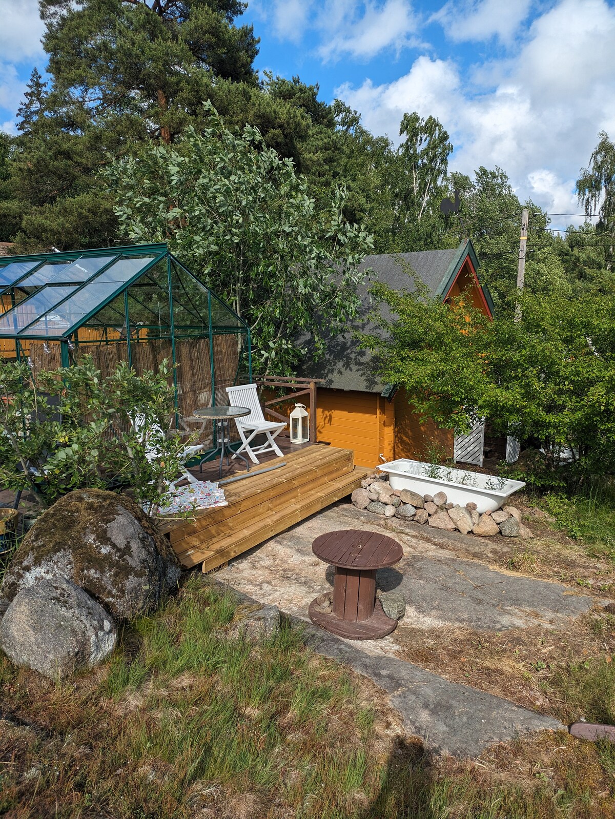 Våkne opp til fuglesang på vakre Veierland! Denne idylliske, bilfrie øya har en helt spesiell ro og atmosfære. Du ankommer Veierland med ferge eller båt. Det finnes to serveringssteder og et bakeri (21/6-3/8). Flere fine badeplasser, svaberg og strender, nydelige tur og sykkelområder. Jeg driver en klinikk i nabobygget og her kan det bestilles massasje eller andre behandlinger. Den lille gule hytta har enkel standard, men høy sjarmfaktor. En oase midt på øya der du kan senke skuldrene