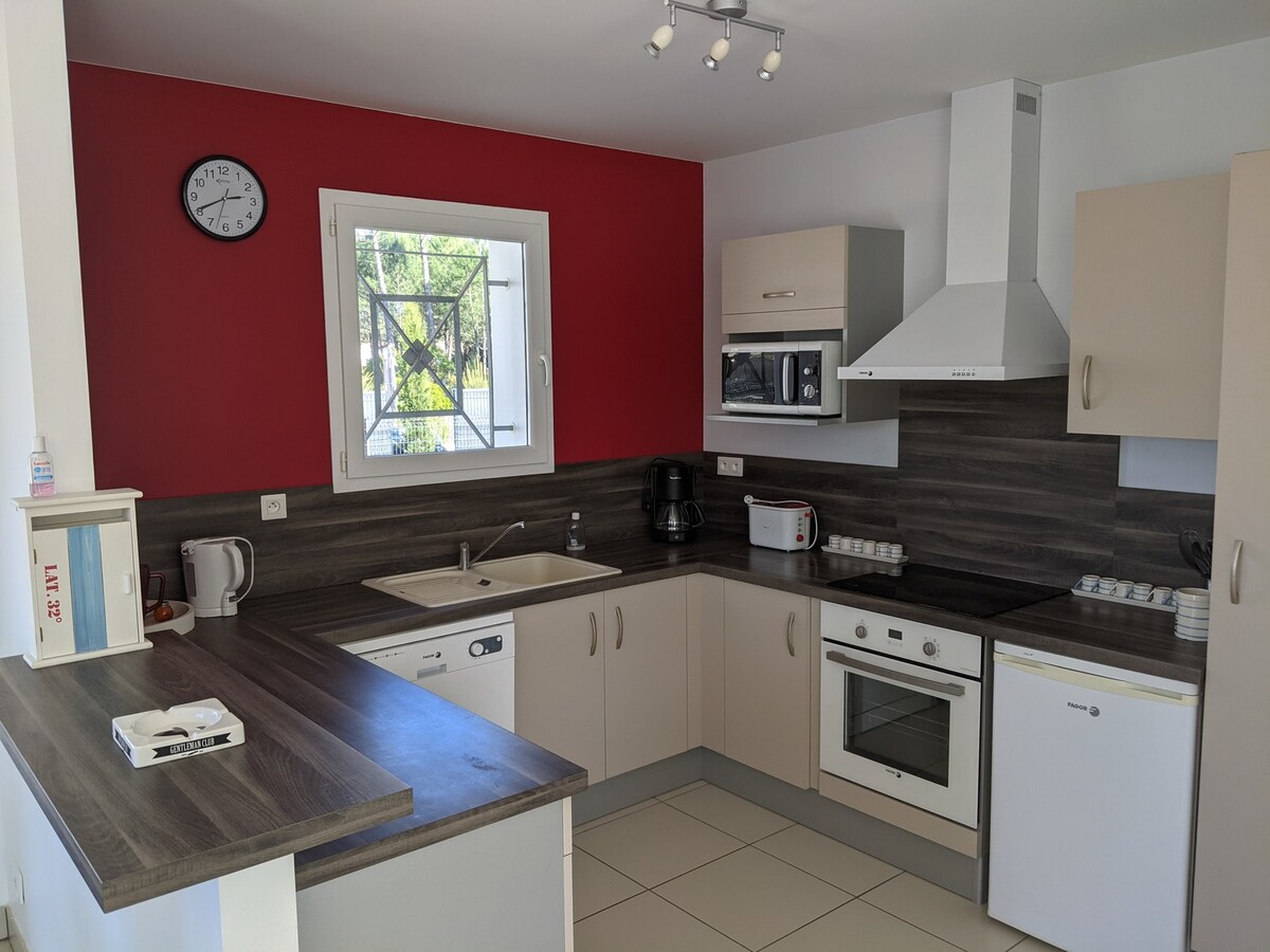 Maison de Vacances à Montalivet. (English speaking Host) Maison neuve pour 6 personnes située au calme à 1,2km de l'océan (environ 12 min à pieds). Entièrement équipée et aménagée, vous vous y sentirez comme chez vous! Composée de 3 chambres dont une suite parentale, 2 salles d'eau au total, 2 WC, une terrasse couverte avec barbecue/plancha/salon de jardin et table extérieure. Cuisine entièrement équipée (lave-vaisselle-four-induction-micro-ondes-lave linge- machine à café -grille pain etc)