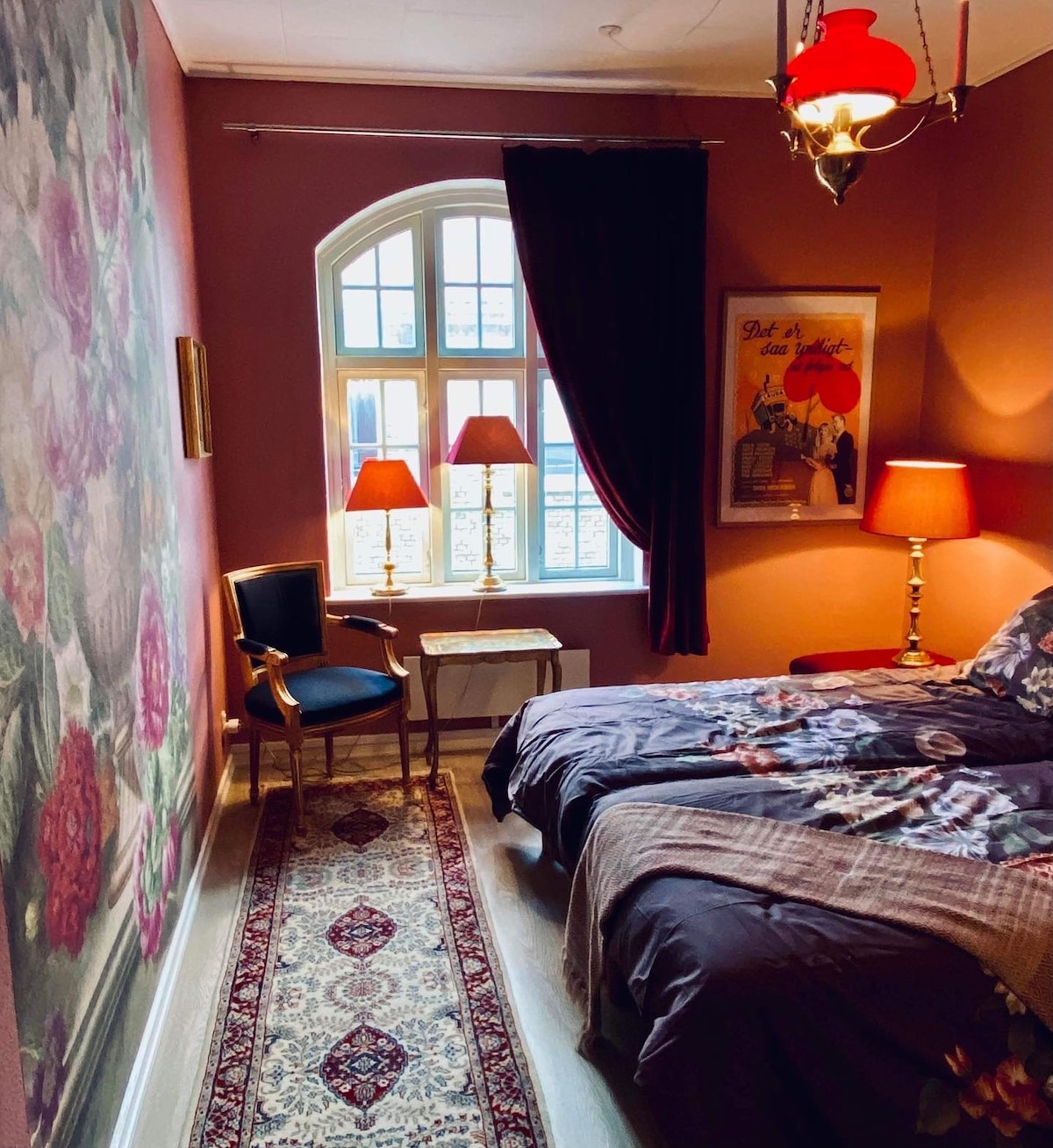 Inspiration by Helle Virkner has shaped this room... the beautiful delicate pink colors combined with 'deep red' as was her political party Helle is known from her roles as the gentle and always intelligent Elisabeth in Matador, Olsen Banden, Huset på Kristianshavn etc. Helle Virkner was married to Denmark's Prime Minister Jens Otto Krag and they were the answer of the time to beauty and power