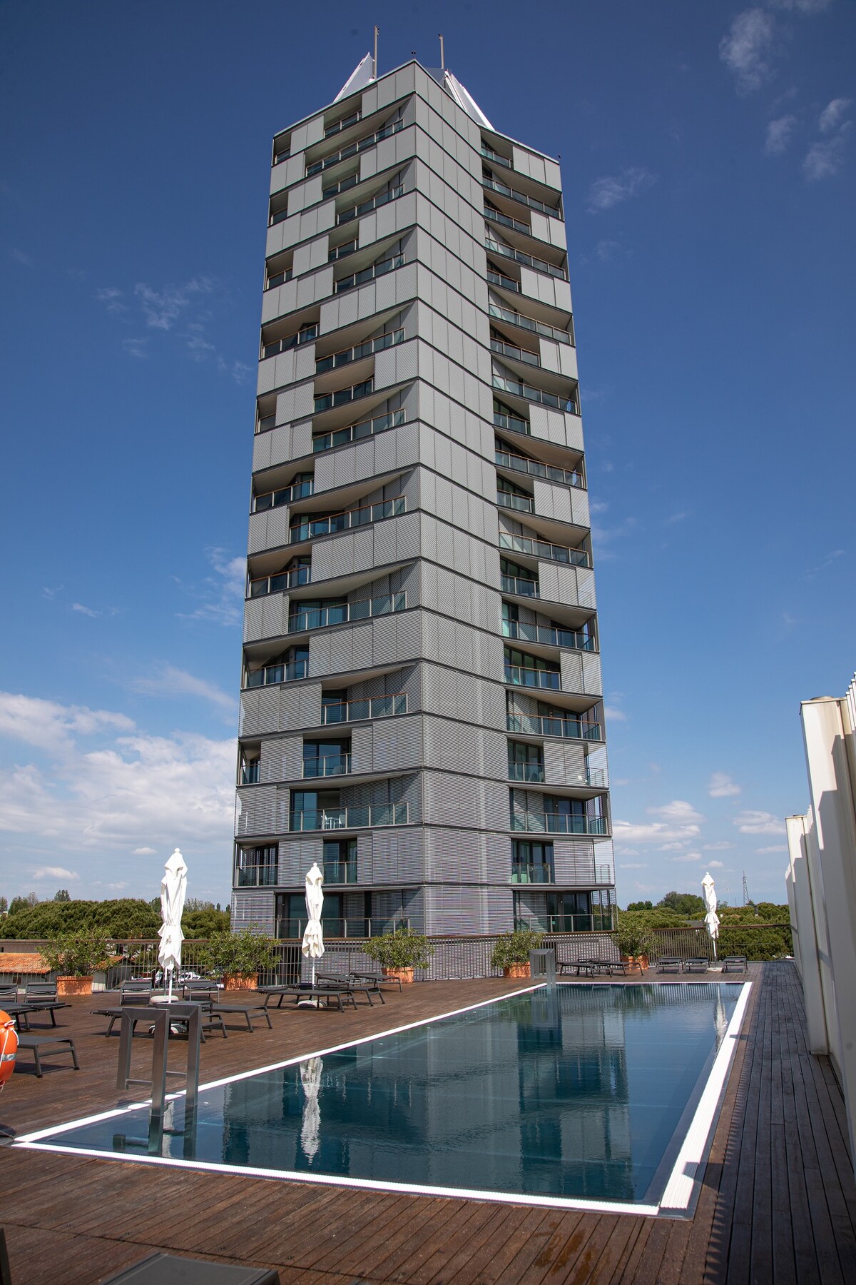Beautiful apartment with modern lines and fine finishes on the fourth floor of the prestigious Torre Aquileia. It has a large living area (with a double sofa bed option), 1 double bedroom, 1 bedroom with 2 bunk beds, 1 bathroom, and a terrace where you can have lunch, dinner or sunbathe with panoramic views. Includes a parking space in a private garage (unusual in Jesolo), the condominium pool and the beach spot near the renowned Capannina.