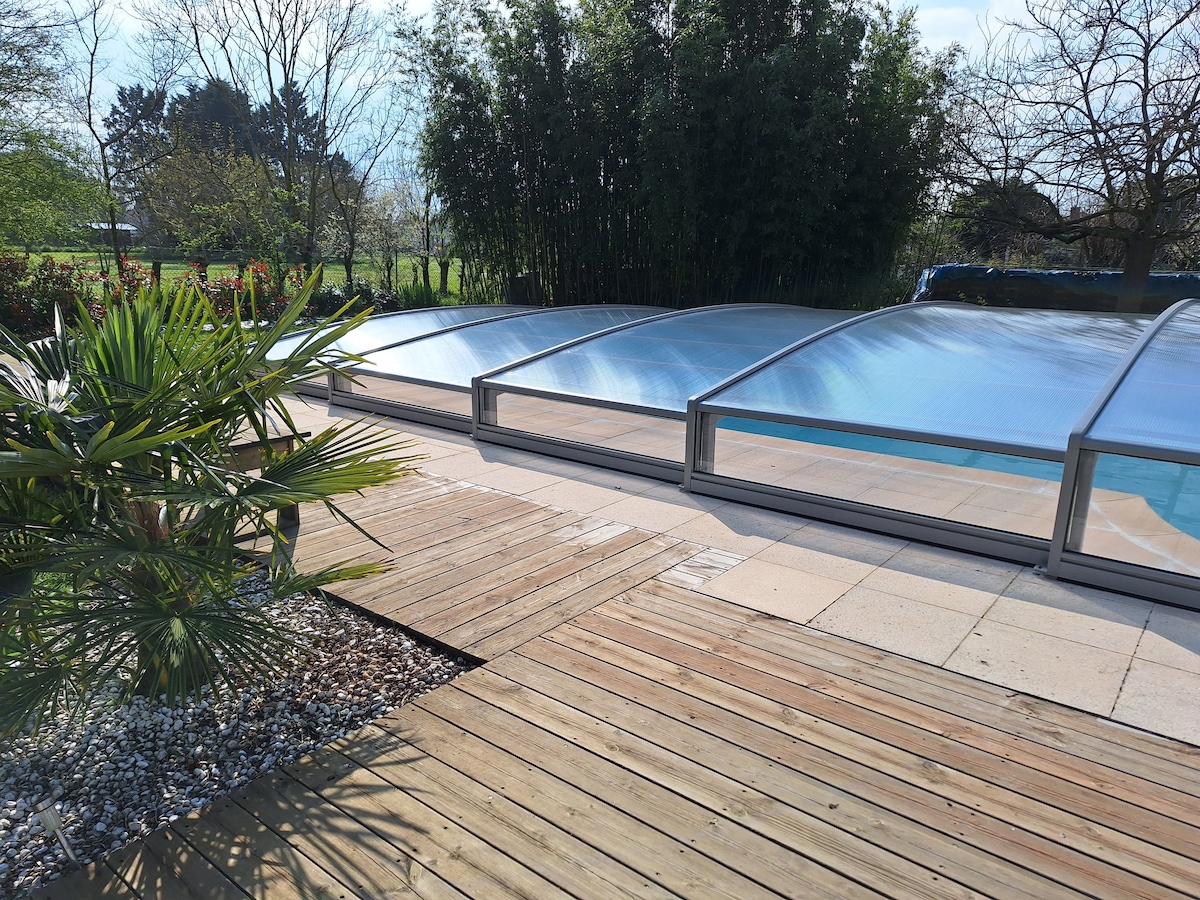 Home near La Rochelle about 15 minutes. Property located next to our personal home but totally independent. The accommodation includes private parking, a fully equipped kitchen, a living room equipped with a sofa bed, 2 bedrooms with 140cm beds, a bathroom with walk-in shower, a 40 m2 courtyard with ping pong table, darts, plancha, garden furniture. Home with a private pool of 4m by 9m covered by a dome, and 4 sunbaths.