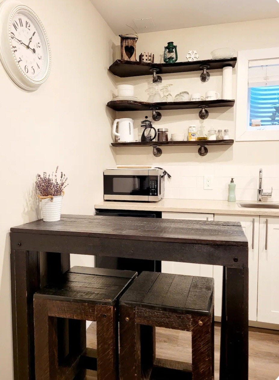 Modern ground level daylight basement suite with fully stocked large kitchen. A/C for the summer, furnace for the winter with electric fireplace, and additional heaters in each bedroom to make sure you are always comfortable. Well lit space with cellular blinds. USB port on each lamp for convenience. Fast 100 mbps internet and smart tv with cable access or streaming services. Kitchen has full sized appliances, water filter system, and an ice maker in the fridge.