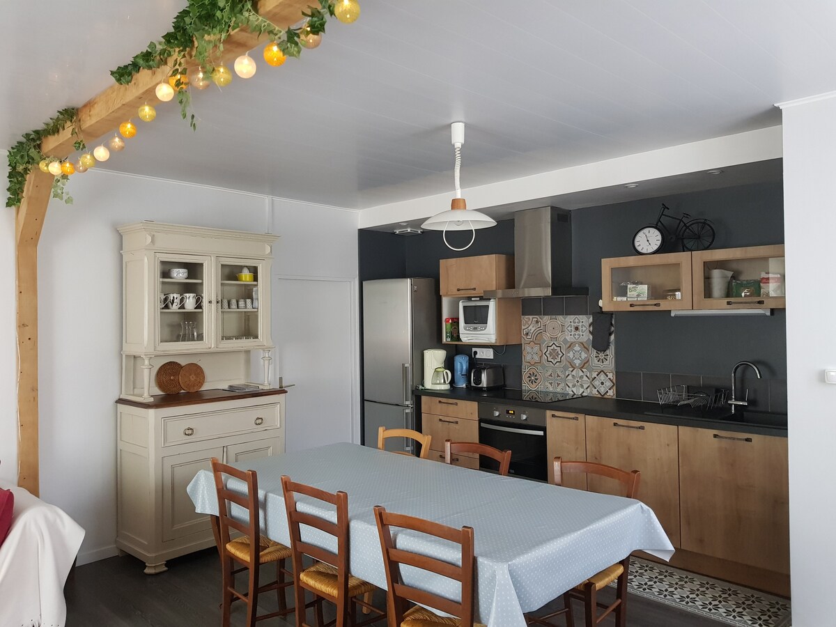 Spacious and bright, located in a green and quiet setting, it is the perfect place to recharge your batteries for families or groups of friends. A kitchen open to the living room, fully furnished and equipped. A warm and friendly stay, perfect for your aperitif evenings, board games or even movies! For remote work, a desk in every bedroom with fiber optic access. A private terrace with garden furniture, a plancha, and a jacuzzi, overlooking the wooded and flowery garden.