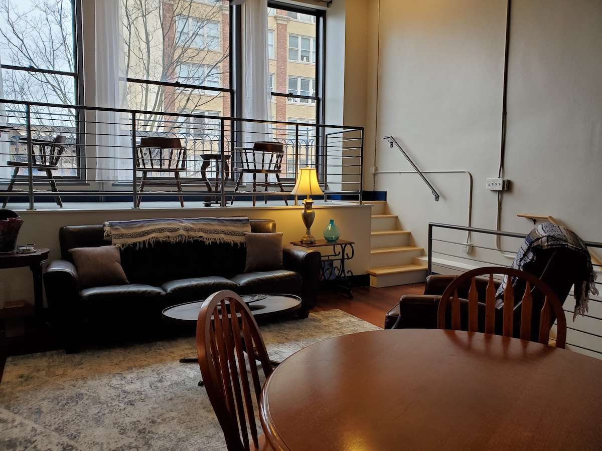 Whether you’re here for business, university, or entertainment, this bright and airy loft is well-suited for an enjoyable stay. This polished space boasts a fully equipped kitchen, en suite laundry, and high ceilings featuring tall windows that radiate plenty of natural light. Street parking is first come first serve. However, complimentary parking is located in the paid lot at the rear of the building. Also, train tracks run in the rear, no horn sounds, but white noise machine provided.