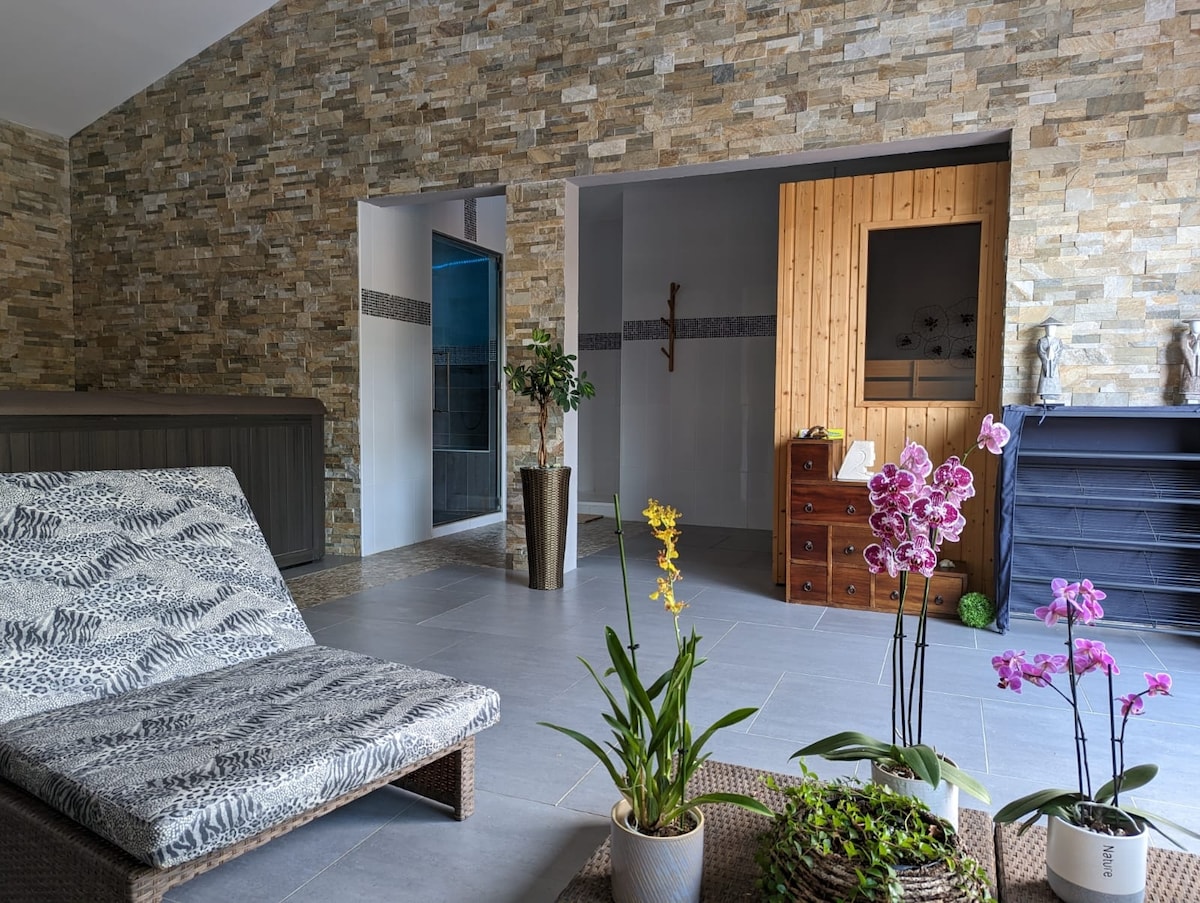 This renovated barn will accommodate up to 9 people with modern comforts and old world charm. Its major assets: . 1 living room of 60 m2 offering quality services, . three bedrooms, each with its own bathroom and toilet, . 1 wood and travertine terrace, with its 8X3 swimming pool, . 1 wood-burning stove, . 1 hangar with its fitness room and games with free access, . 1 spa area with private access of 2 hours with several offers proposed.