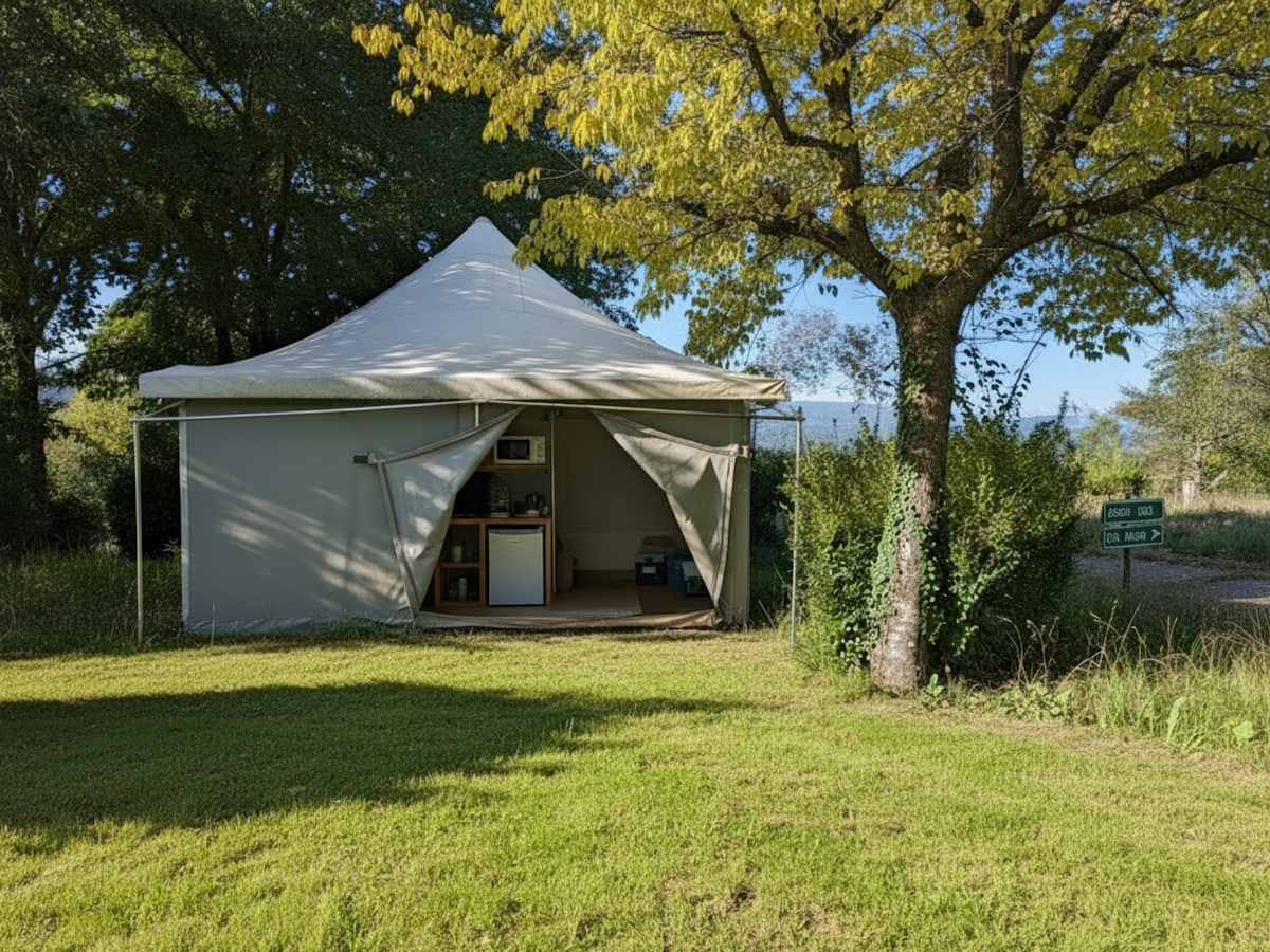 Stay in a tent in the heart of nature, in the shade of chestnut trees, ideal for a simple and authentic getaway. Designed for 4 people, it includes two bedrooms, a kitchen area, a dining table, as well as a terrace. You'll also have access to a shared pool. Bed linen and towels are not provided. One 140 cm bed + 2 90 cm beds.