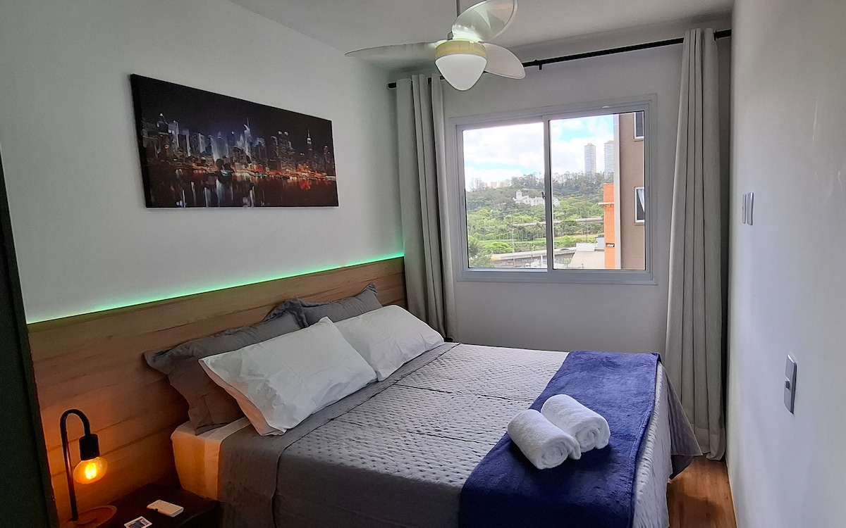 Relax in this unique and quiet place. Full kitchen with appliances, 43" smart TV, mobile fan in the bedroom, towels and bedding, beautiful view, close to shopping center, subway station and CPTM train, 15 min to Congonhas Airport, Berrini and Pinheiros, just a 7-minute walk to EXPO TRANSAMERICA, 10-minute walk to VIBRA, 15 minutes to Interlagos racetrack. Parking next to the building R$ 10.00 -25.00 for a 12-hour period or free on the street CHECK-IN AFTER 3 P.M.