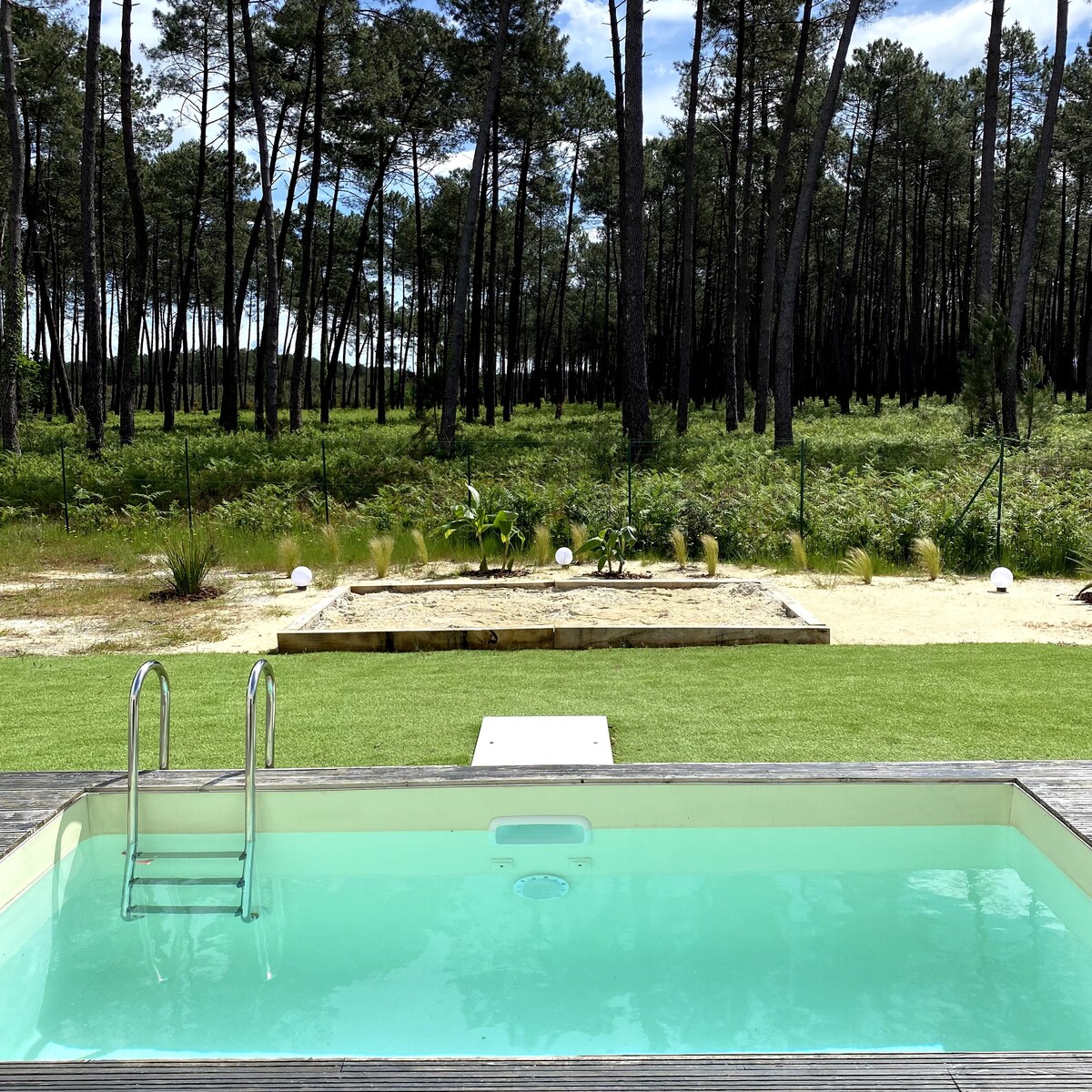 New house surrounded by forest next to the bike path and beaches of the Landes coast It consists of a living room with open-plan kitchen, 3 bedrooms including 1 master suite with bathroom and toilet, and another bathroom and separate toilet. Fiber internet 🛜 Outside, a south-facing swimming pool of 4 by 8.5 m heated from April to November 11 with landscaped garden and 110 m2 of wooden terrace. Moliets-et-Maa beach and golf 10 minutes away Vieux Boucau 15 min Hossegor 28 min. Biarritz 50 min