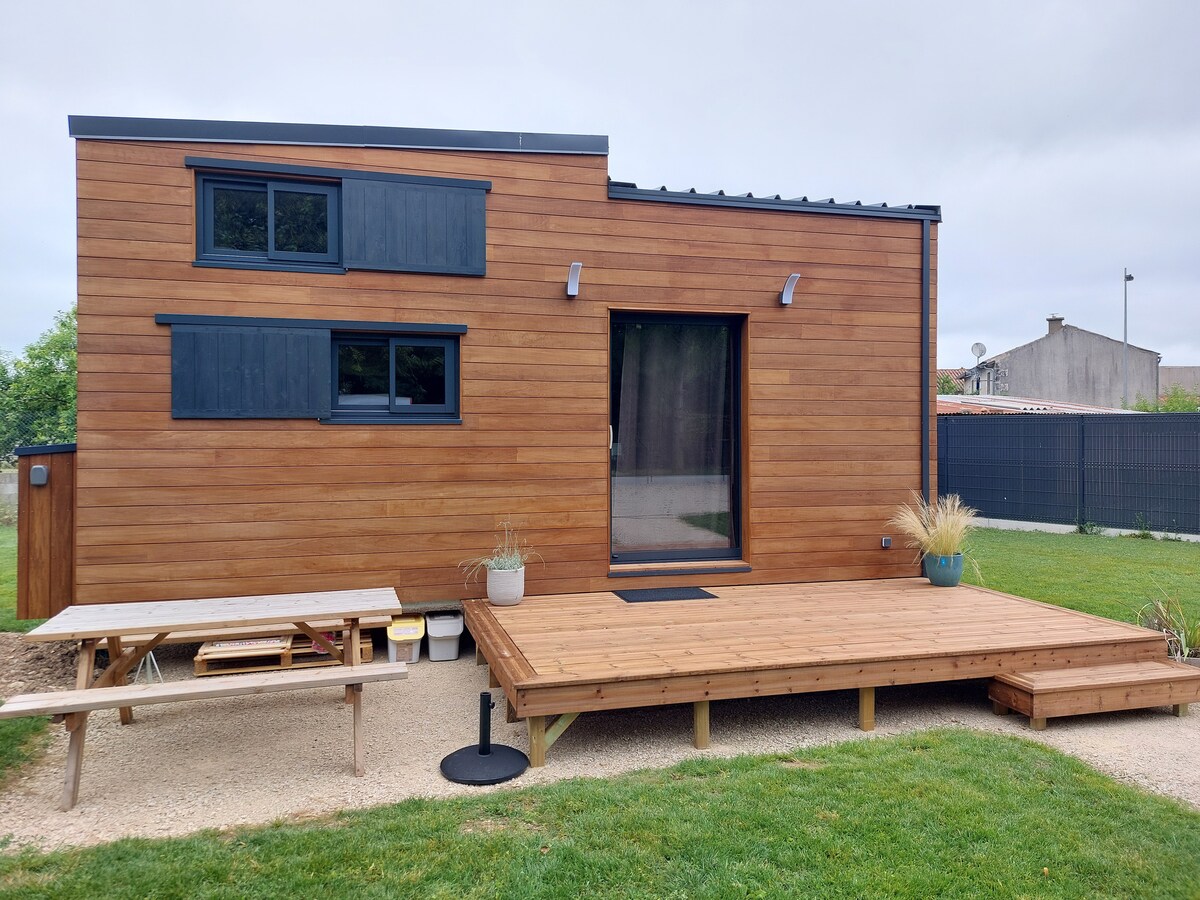 Comfortable Tiny house for 2 guests, cosy and completely self contained. It is composed with 1 queen size bed, memory foam mattress, 1 couch, 1 TV, free Wifi, separate complete kitchen ( kettle, fridge, microwave, cooker, coffee maker, dishes), separate bathroom (hair dryer) with large bath and WC, wooden deck, swimming pool 8x5m (open from June to September). Breakfast and bath towels included. Private and secured parking, located at 10 min from Futuroscope Poitiers center city by car.