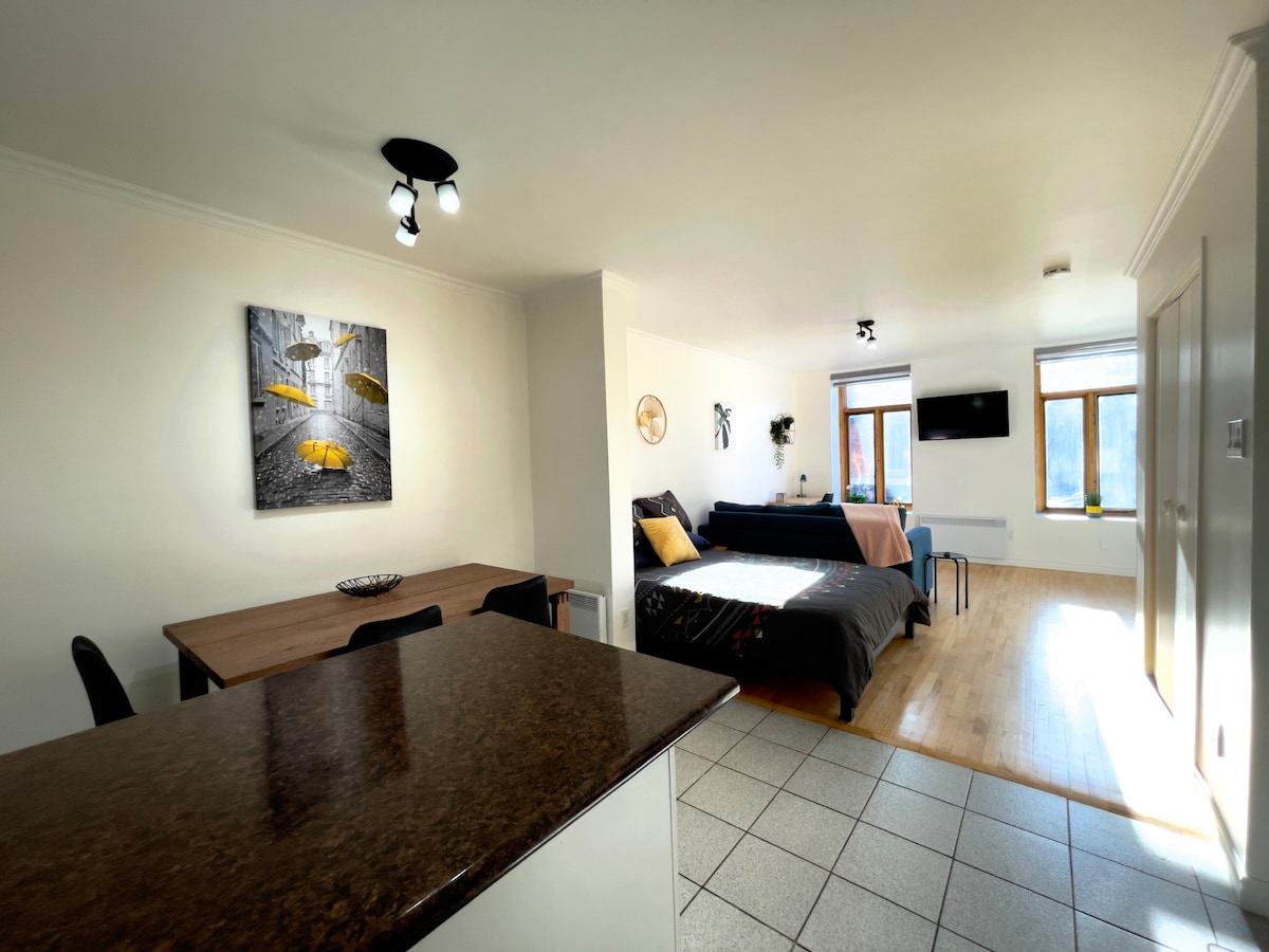 Cute and comfortable studio apartment freshly renovated. Fully equipped kitchen, dining space for 2, double size deep sofa to watch movies on the TV screen , queen size bed, shower (height of 6’6’’/2m max)… etc. Everything to make our apartment your base while you explore everything Quebec City has to offer.