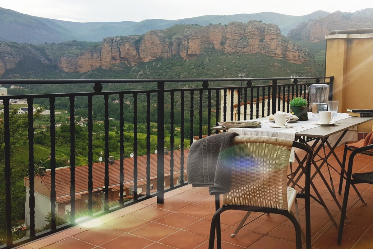 IIt is a two-story studio with only three steps. The accommodation has a kitchen, a living room and a bedroom with a bathroom. It has a large terrace that can be accessed from all rooms. The view of the mountains is impressive. You can enjoy a good lunch or dinner admiring the magnificent mountains. It has air conditioning and ceiling fans to make the stay in summer more pleasant for our guests.