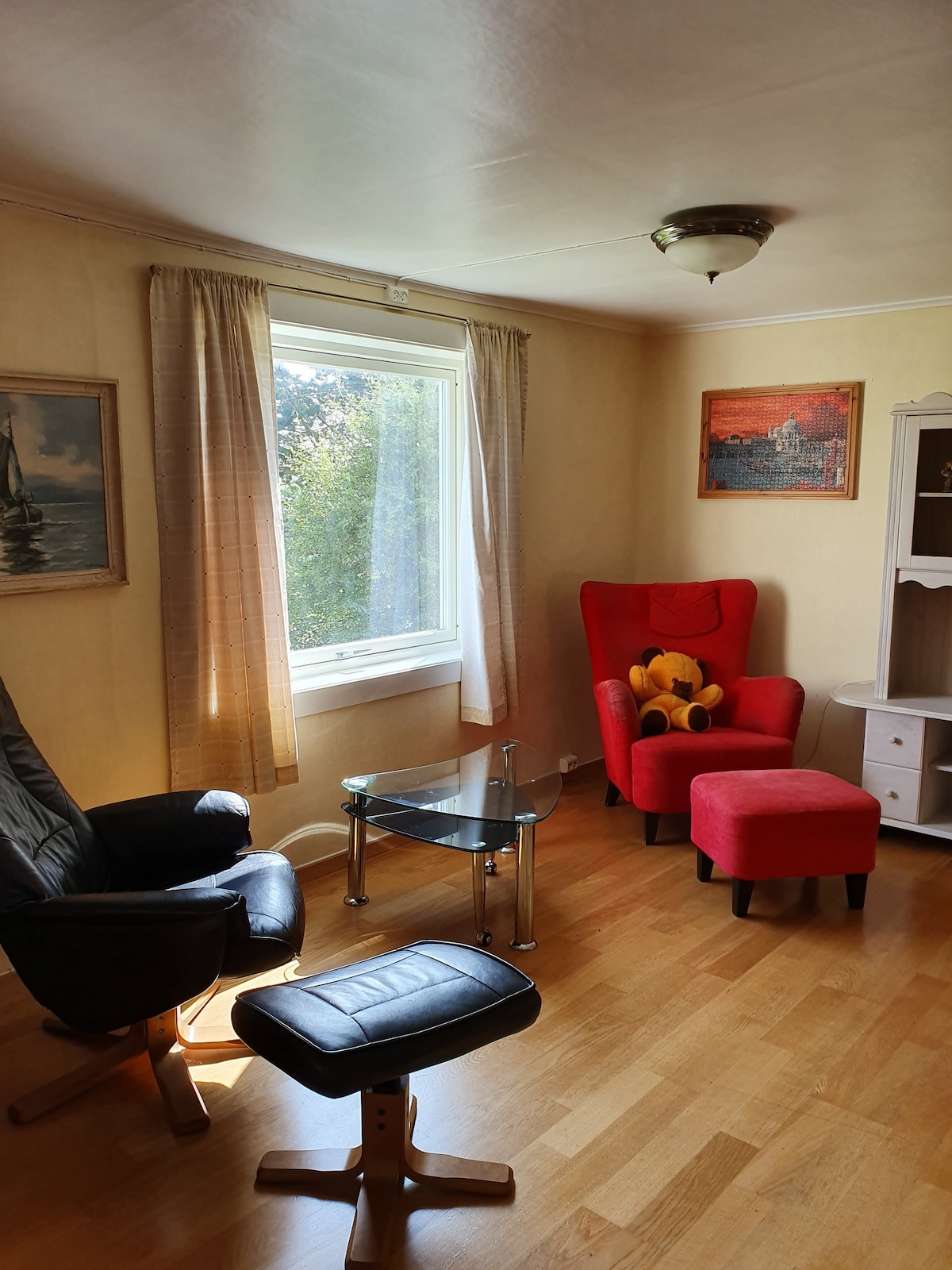 Forget your worries in this spacious and peaceful place. Renovated old cozy house. 4 bedrooms. Porch outside the bedroom overlooking the lake. There is also a spacious veranda downstairs with a small group of garden furniture. Fire pit for cozy evenings. No smoking. Pets allowed. Wood burning. Do not burn anything other than wood in the oven.