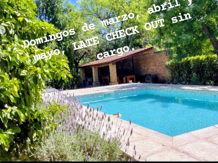 Hello, we are a married couple who enjoy a unique space, with spectacular views of Cerro Champaquí and the border, as well as the entire valley in general. A 6,400 sq. meter park and a 9x4.5 pool with a wet solarium and hydro. We offer you a separate cabin of our house with a private bathroom and its own entrance and parking space. We have pets so we can't host guests with pets. We offer you the warmth of our environment with access to the pool.