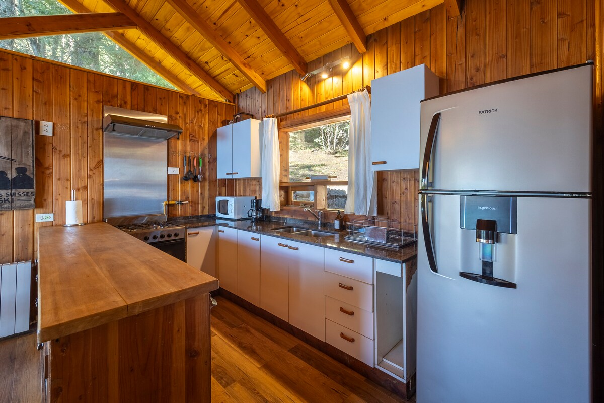 A warm, rustic-style cabin on the shores of Lake Nahuel Huapi with a hot tub, wood-burning fireplace, and deck. A studio created for relaxation and romance with a view of the sunrise and moonrise over the lake. Smart TV and FIBER OPTIC internet with WiFi for working. A kitchenette with everything you need, including a Dolce Gusto coffee maker. A safe to protect your notebooks when going for a walk. Full bathroom. Pool, ping-pong. Beach: Kayak and standup paddle. Continental breakfast.