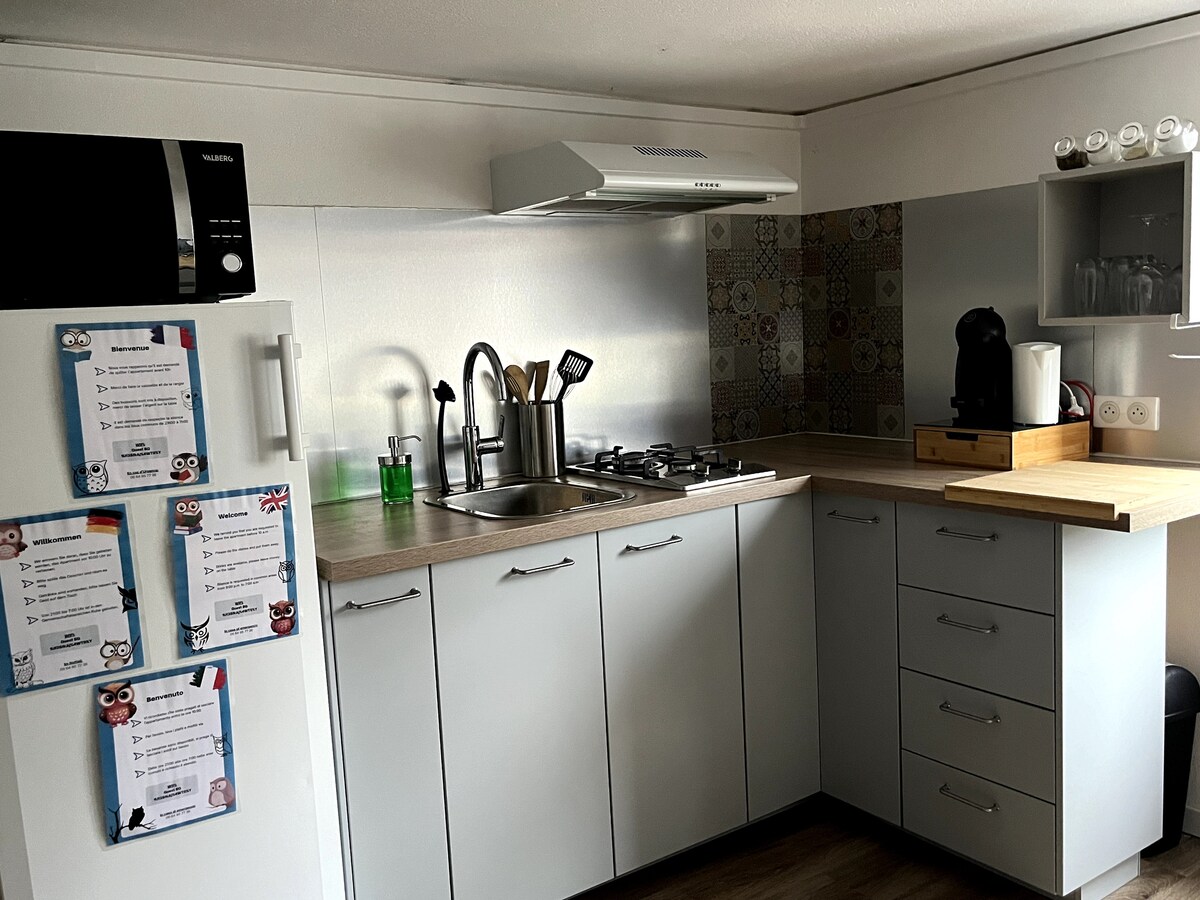 Studio cozy, entièrement équipé en centre-ville de Huningue • 1 lit double confortable + 1 lit bébé • 1 place de parking gratuite avec arceau • Proche de la place Abbatucci, du Rhin, du Pont des Trois Pays, Parc des Eaux Vives • Proche de Bâle (frontière suisse), de Weil am Rhein (frontière allemande) • Aéroport EuroAirport à 10 minutes en taxi • Centre-ville de Bâle à 15 minutes en vélo • Bus et tram vers le centre de Bâle (gare SBB à 25 minutes en transports) • Restaurants, bars à 100 m • 🗣️🇫🇷🇩🇪🇬🇧
