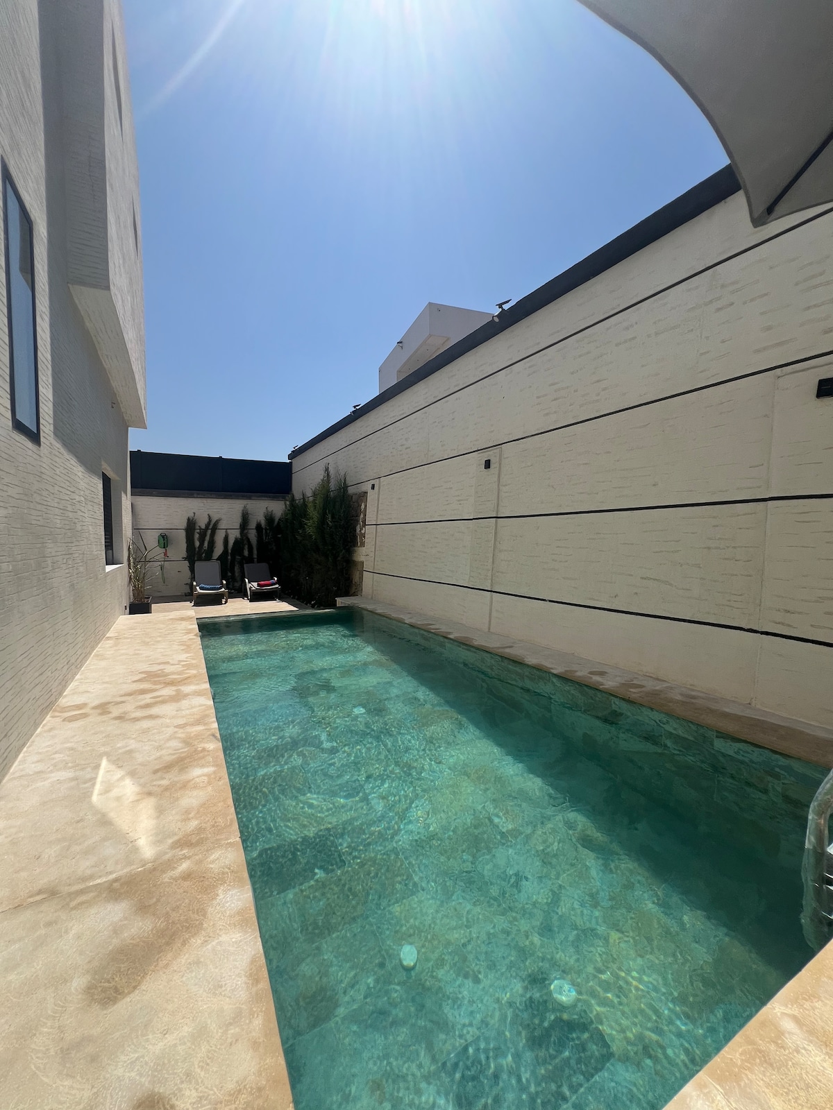 Island-Inspired Stay Just 5 Minutes from the Beach Relax in this private, sun-soaked retreat featuring a pool, palm trees, and a charming outdoor kitchen with a wood-fired oven. Natural materials, minimalist style, and peaceful vibes — all just a 5-minute walk to the beach. Perfect for couples, families, or anyone looking to unwind in style.