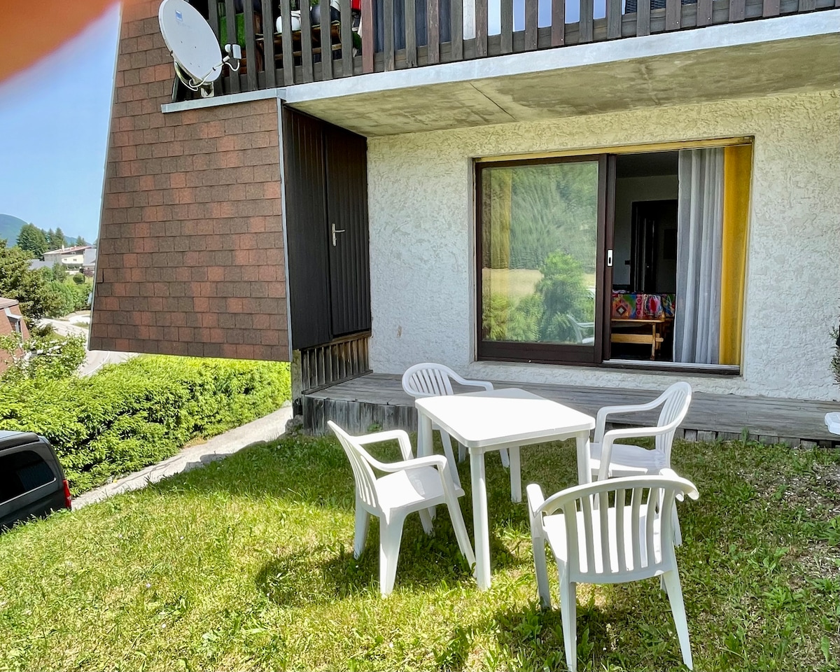 You will be able to relax in this pleasant 45 m2 apartment for 4 to 6 people on the ground floor. 5 minutes to shops and restaurants. 2 minutes from free shuttles to access the slopes. Enjoying the views of the mountains and the many activities. Tree climbing, hiking (sporty and family), Paintball, Archery, Water Ball, Downhill Mountain Biking, Trails, Aquatic Center, Ice Rink, Casino, Library, Fitness Area, Bowling, and Movie Theater."